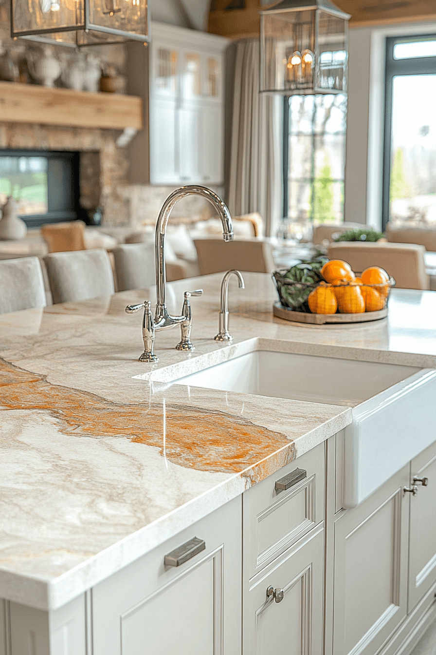 A soft beige base with delicate golden veining gives granite countertops a warm and elegant glow. The light-reflective surface helps brighten the room while adding a touch of understated luxury. This versatile look pairs beautifully with both light and dark cabinetry. Granite’s durability ensures the surface remains stunning over time. It’s an ideal option for creating a welcoming, airy atmosphere. Tap to uncover more granite countertops with warm, radiant tones.
