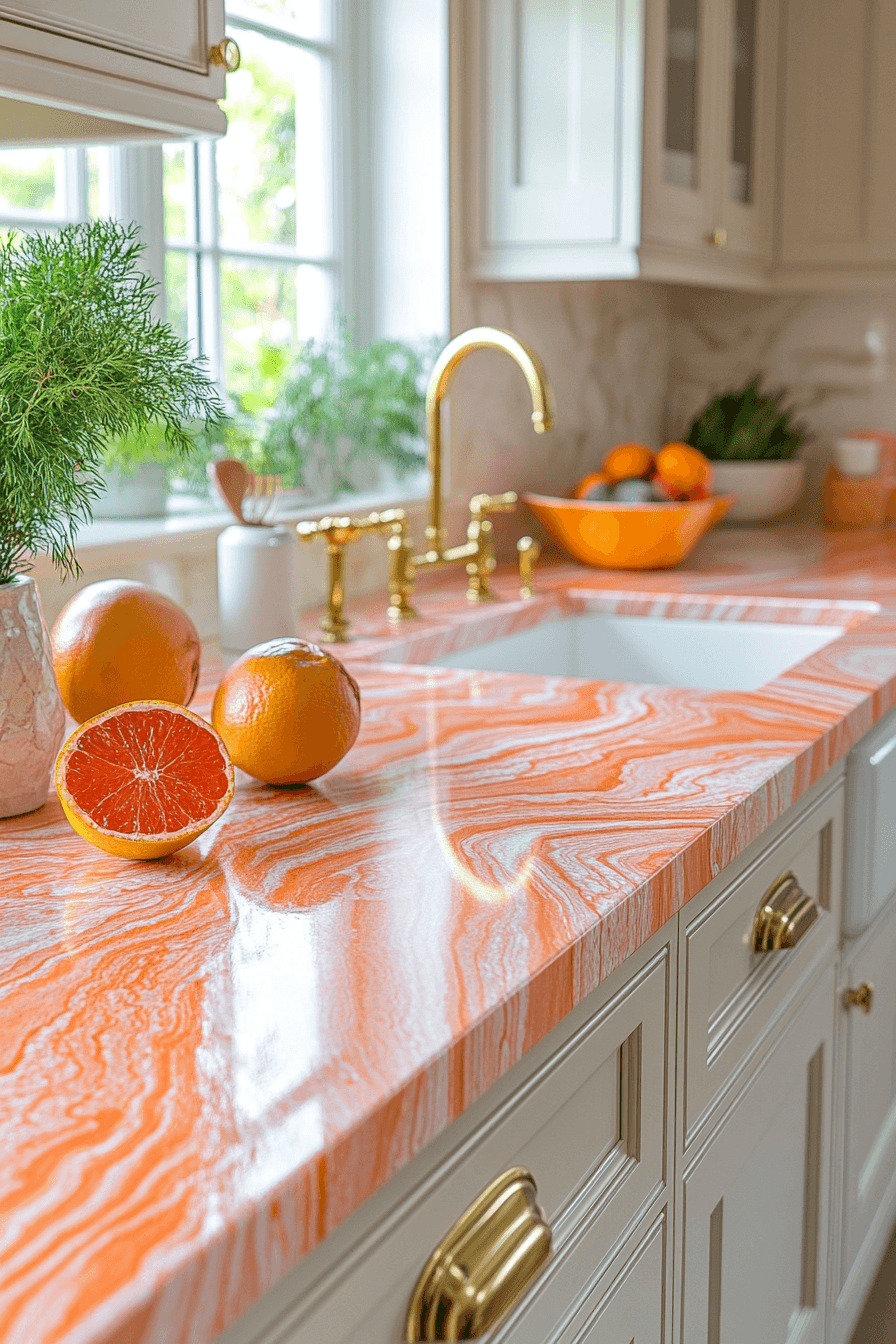 Vibrant color takes center stage with granite countertops featuring bold coral tones accented by streaks of white and gold. This lively combination instantly energizes the space and adds a unique design statement. It pairs well with both modern and traditional elements, offering great flexibility. The brightness brings personality while still feeling polished. Granite’s strength ensures it stands up to everyday use. Tap to explore more granite countertops that add a pop of color.