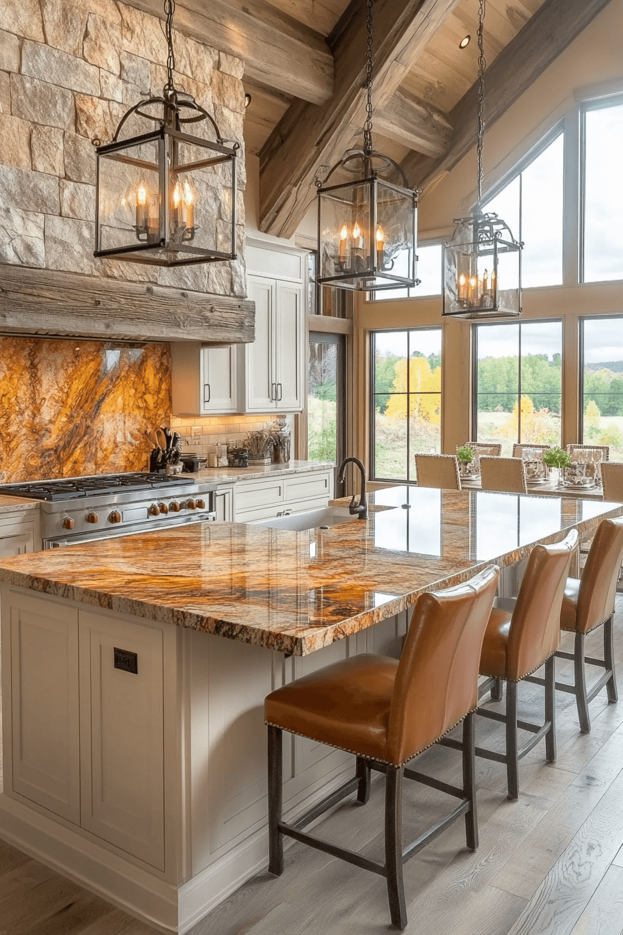 Radiating warmth and elegance, granite countertops with golden tones and soft veining bring a luxurious glow to any room. The blend of gold, cream, and brown hues creates depth while reflecting light beautifully. This style pairs perfectly with darker cabinetry and metallic accents for an upscale feel. Granite’s long-lasting durability ensures the beauty stays intact over time. The overall look feels rich, inviting, and refined. Tap to uncover more granite countertops with a golden, elegant touch.