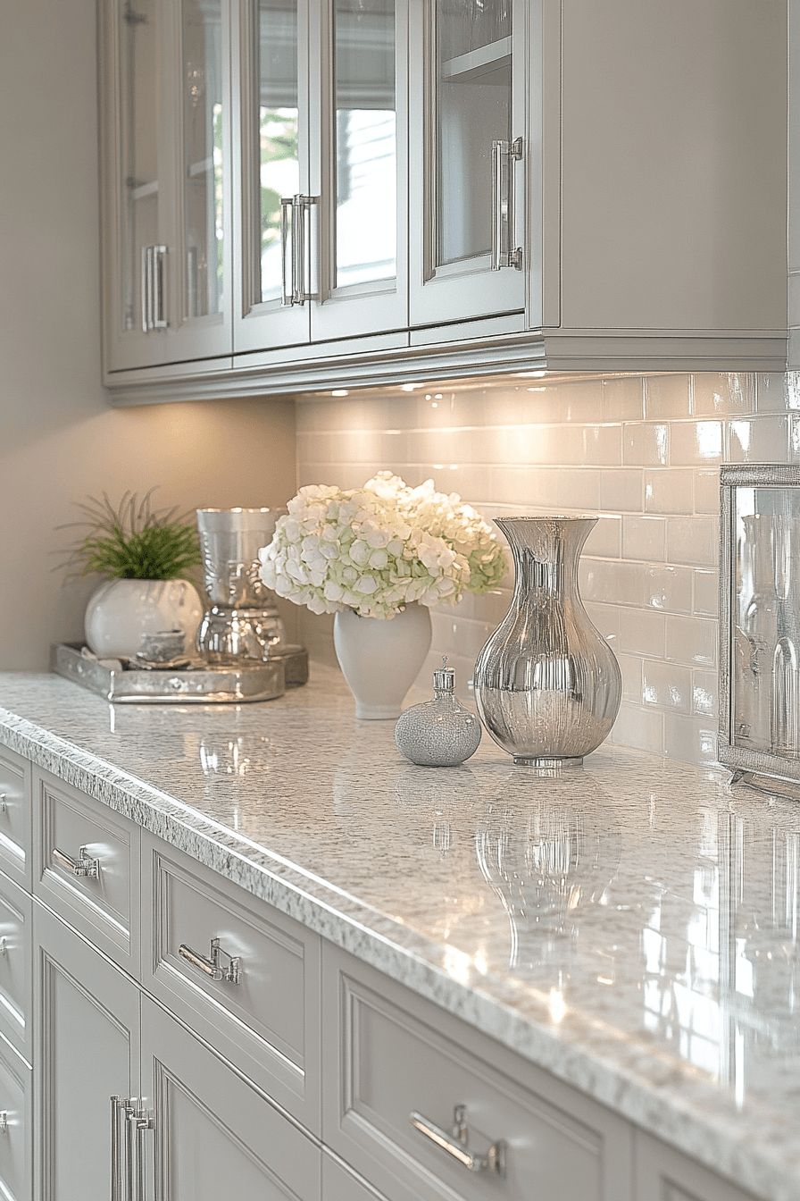 Soft shimmer and refined detail define granite countertops with a pearl-like base accented by gentle gray and white undertones. The subtle glow helps reflect light, making any kitchen or bathroom feel more open and elegant. This style works beautifully with both modern and traditional designs, offering incredible versatility. Beyond looks, granite’s durability makes it a reliable choice for everyday living. The overall feel is polished, bright, and timeless. Tap to explore more granite countertops with luminous elegance.