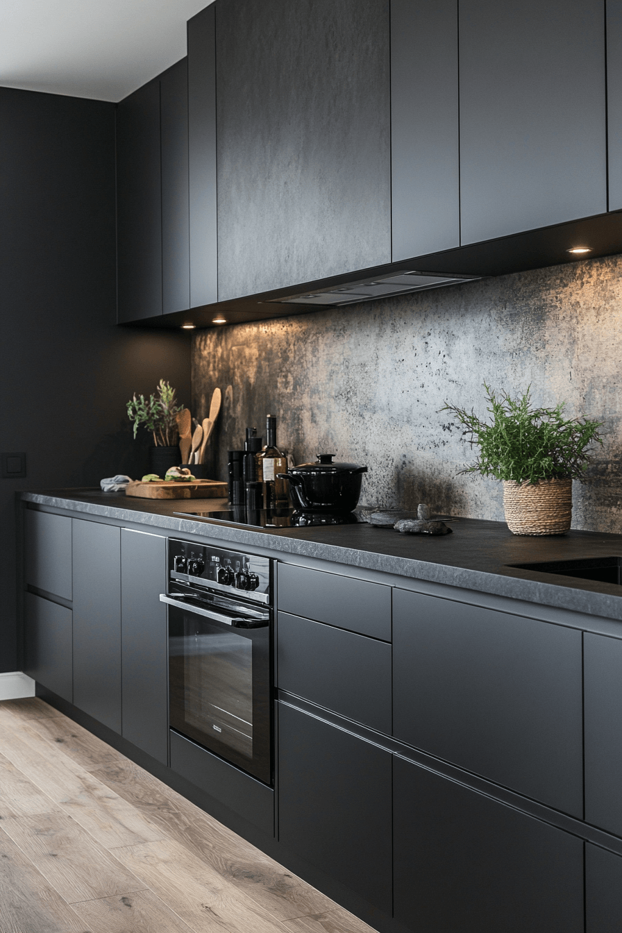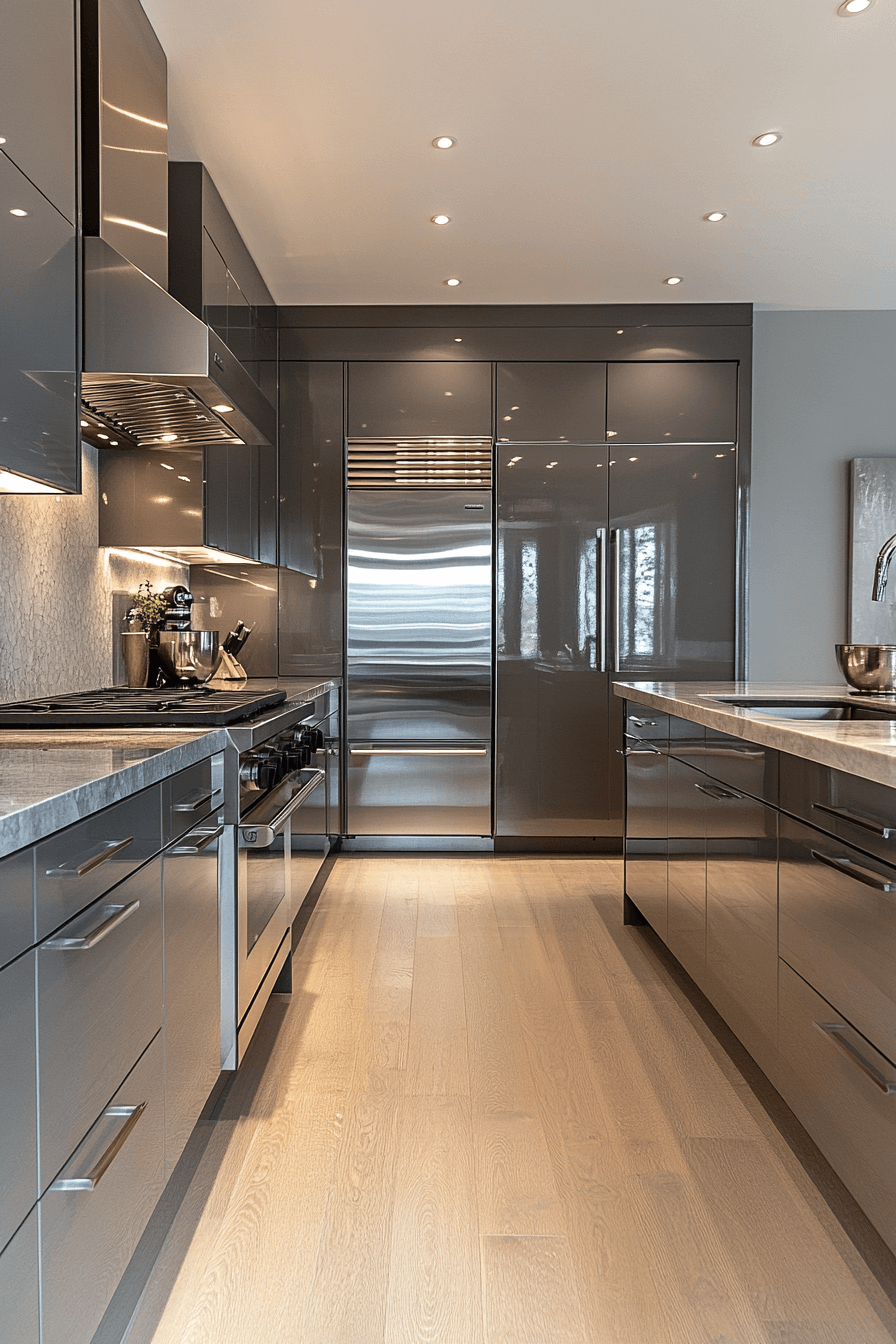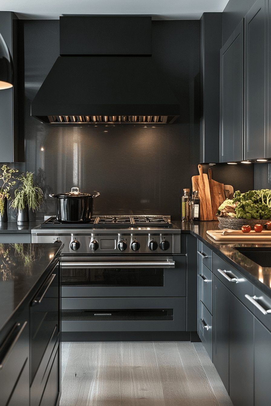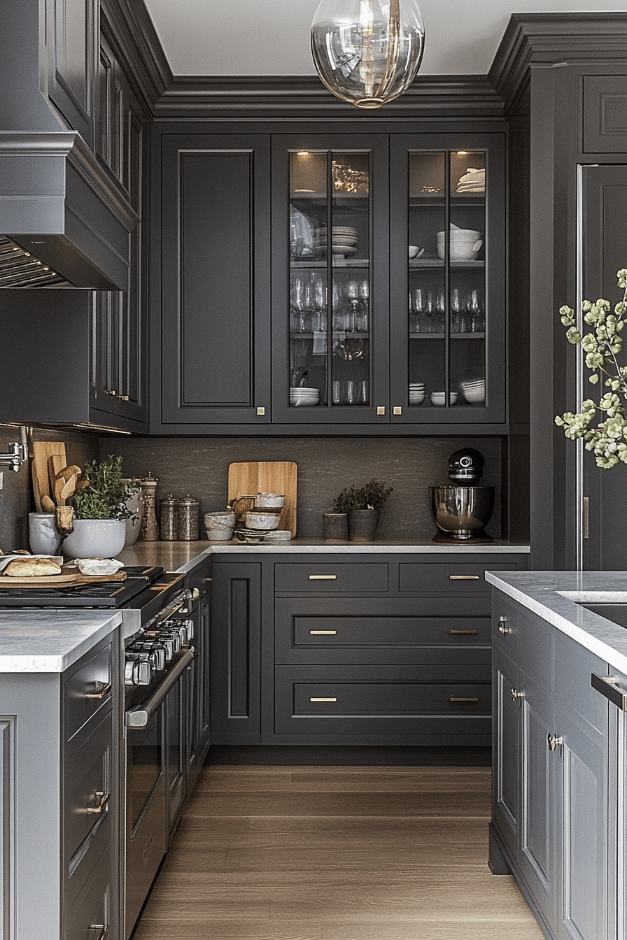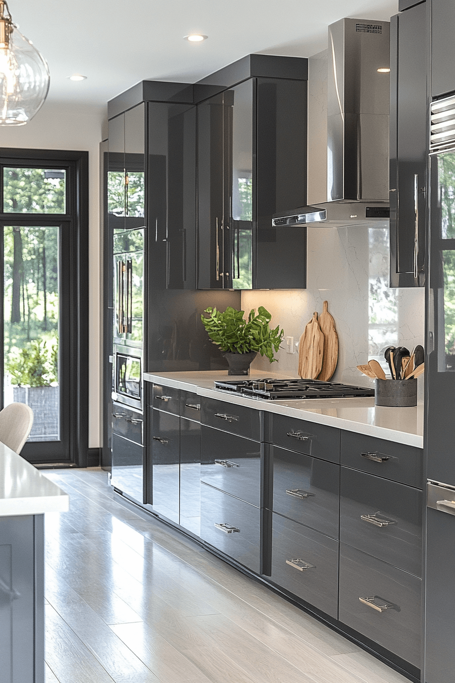 Gray kitchen cabinets in a graphite tone make a bold luxury statement with their high-gloss finish. This rich, deep gray color reflects light dramatically, adding glamour and depth to your space. Graphite gray pairs beautifully with both vibrant decor and muted tones, adapting to various moods. It’s ideal for contemporary kitchens where shine and drama are welcome. This look feels polished, powerful, and unapologetically modern. Explore graphite gray kitchen cabinets for an ultra-sleek upgrade!
