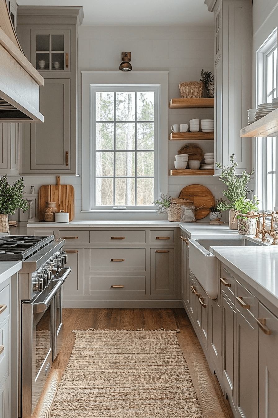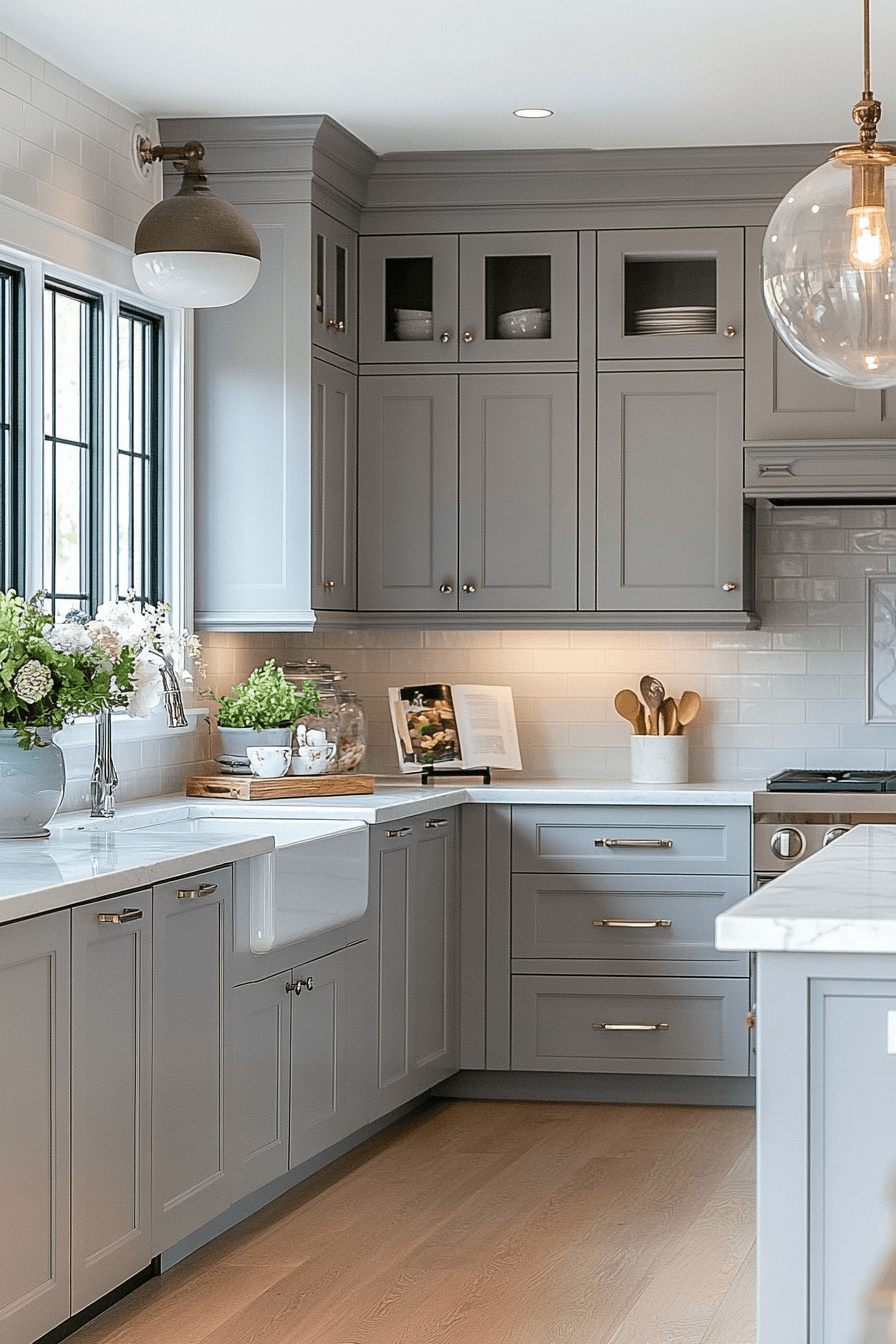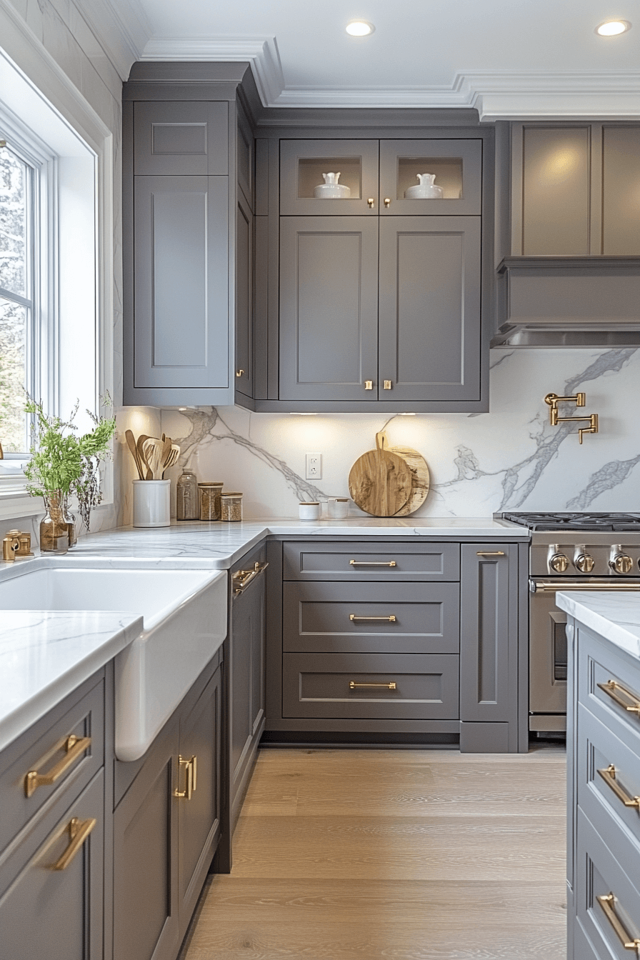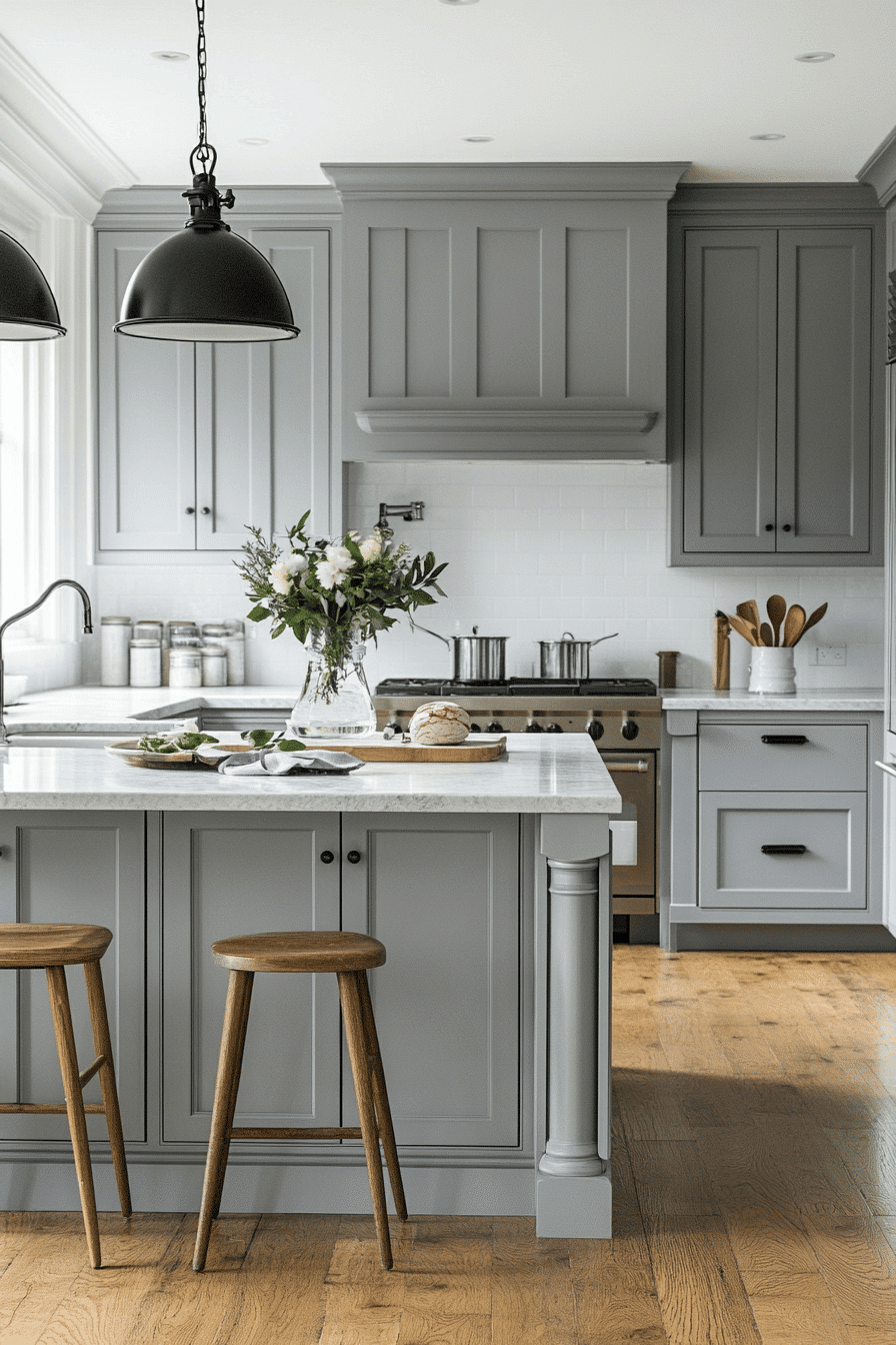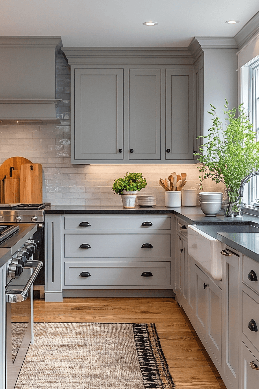 Pebble-toned gray kitchen cabinets add a friendly and inviting vibe with their light, balanced hue. This versatile shade merges traditional charm with modern sensibility for a look that feels both grounded and stylish. Pebble gray suits everything from beachy kitchens to Scandinavian minimalism. When paired with wood accents or brushed metal, the texture comes to life. The result is effortlessly cozy and refreshingly chic. Tap into pebble gray kitchen inspiration that radiates warmth!