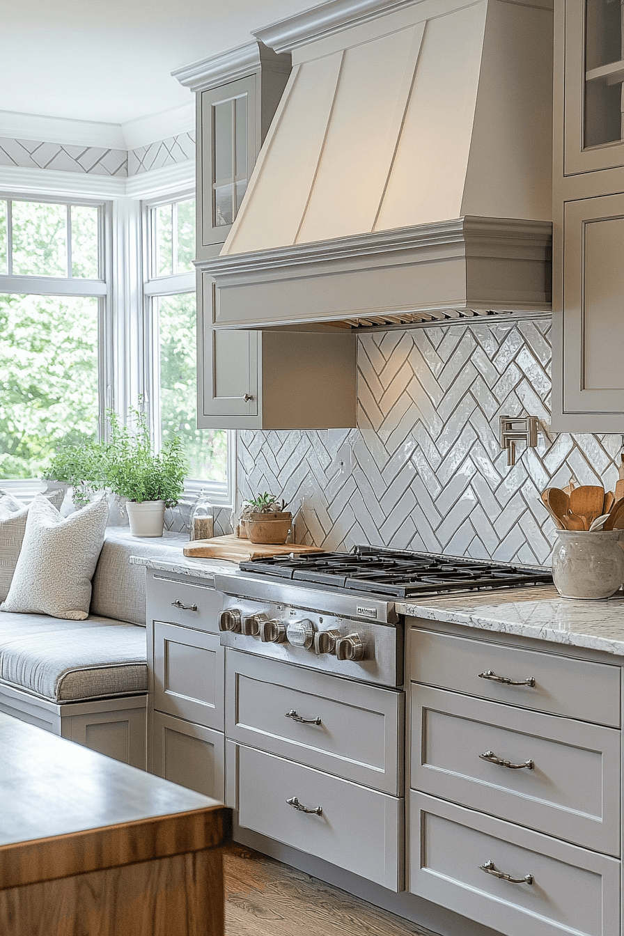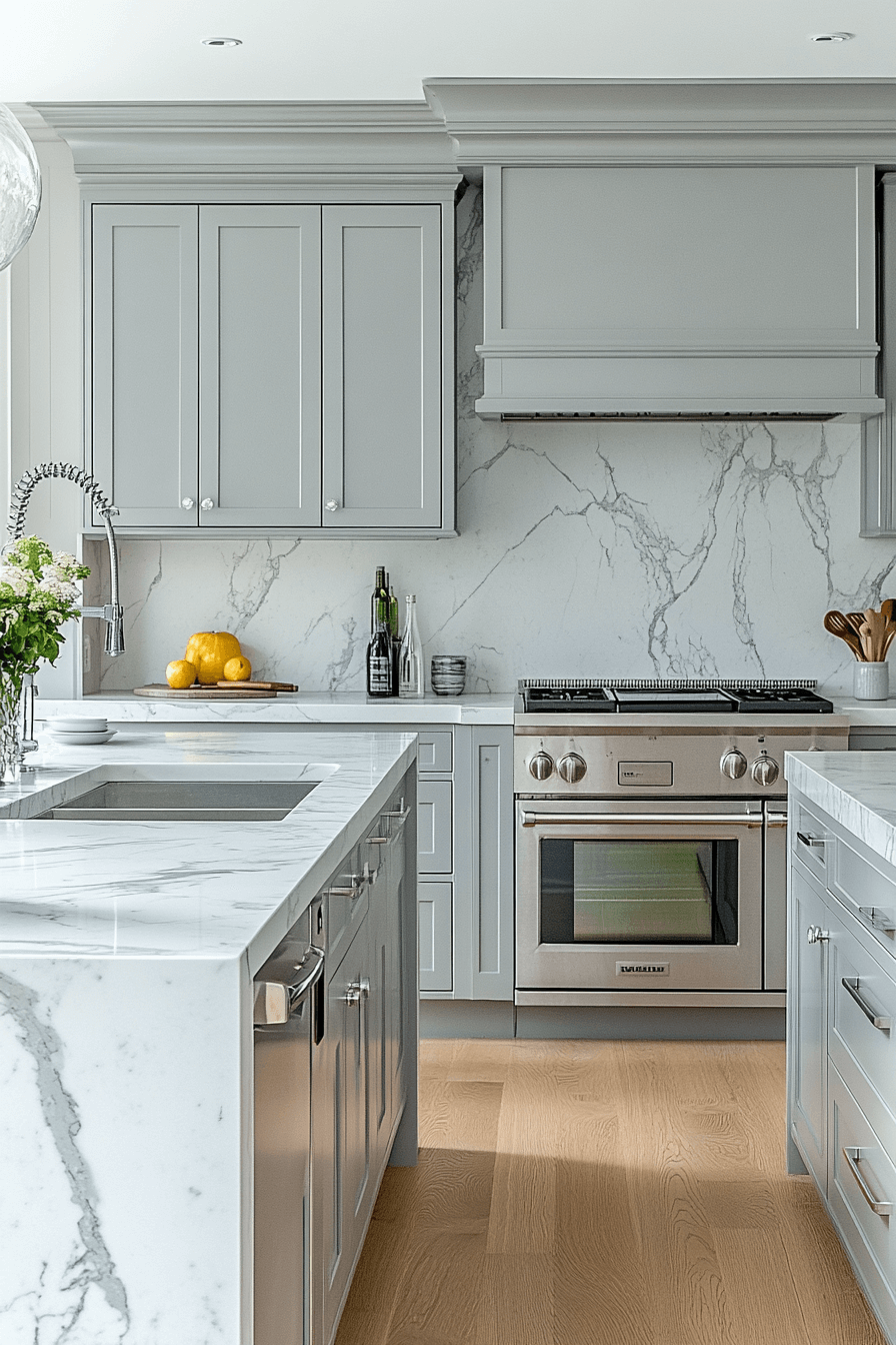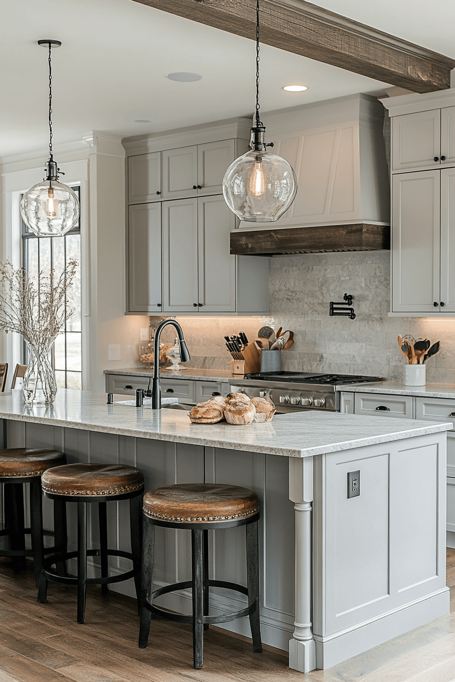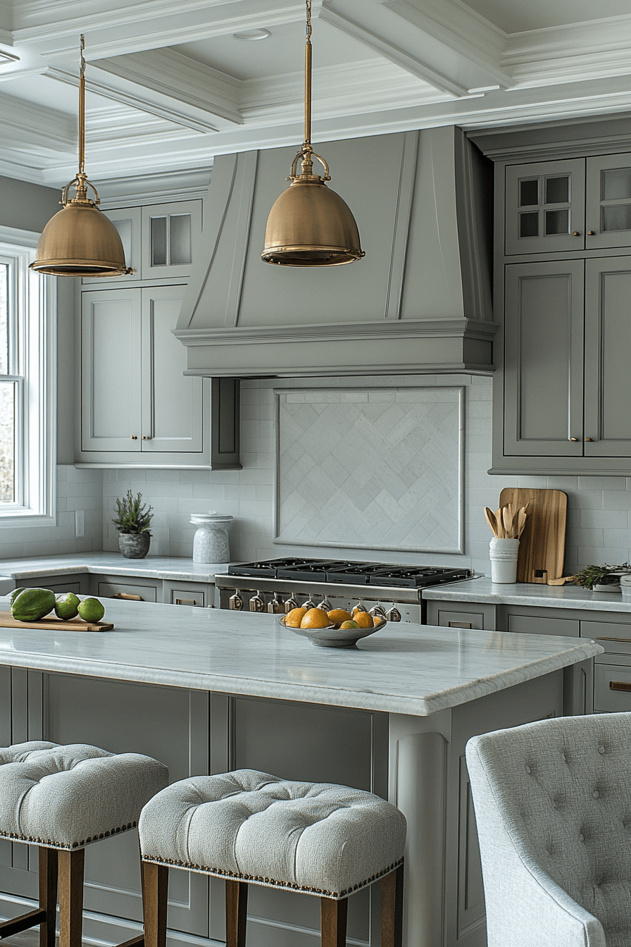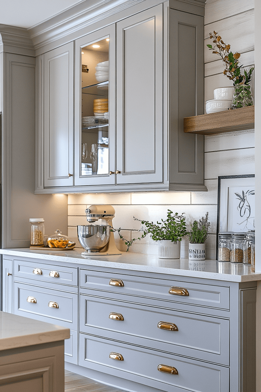 Pebble-toned gray kitchen cabinets add a friendly and inviting vibe with their light, balanced hue. This versatile shade merges traditional charm with modern sensibility for a look that feels both grounded and stylish. Pebble gray suits everything from beachy kitchens to Scandinavian minimalism. When paired with wood accents or brushed metal, the texture comes to life. The result is effortlessly cozy and refreshingly chic. Tap into pebble gray kitchen inspiration that radiates warmth!