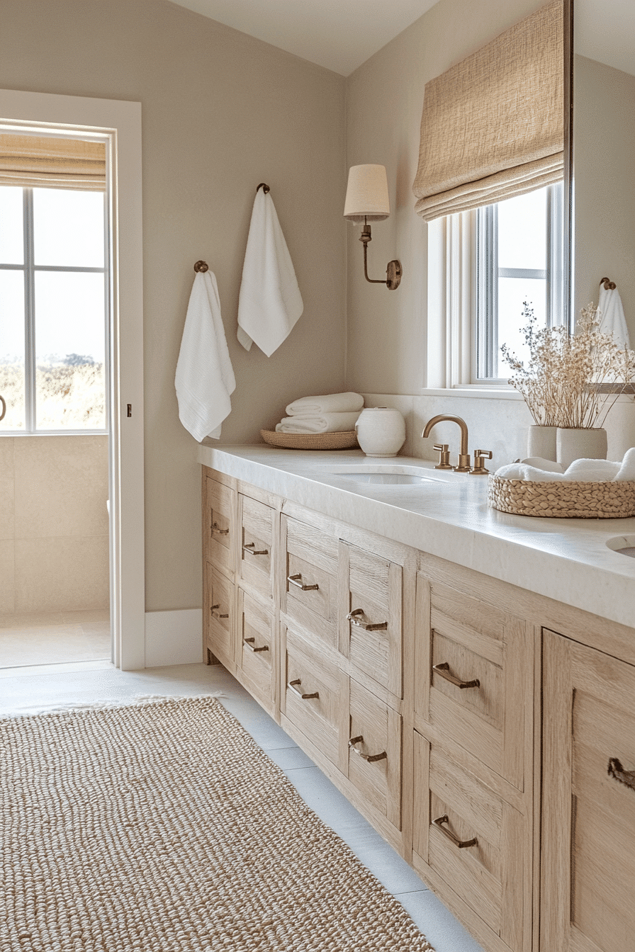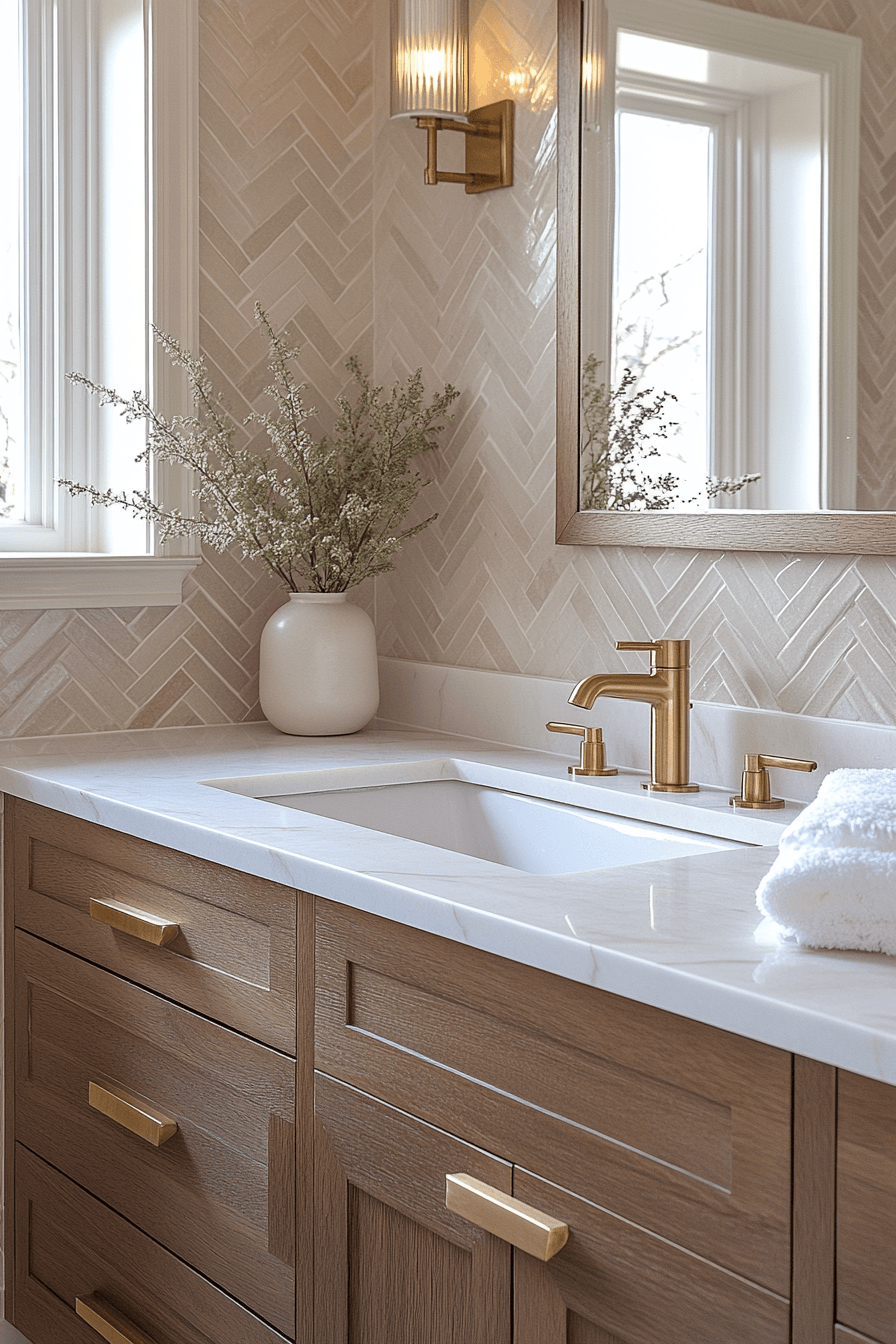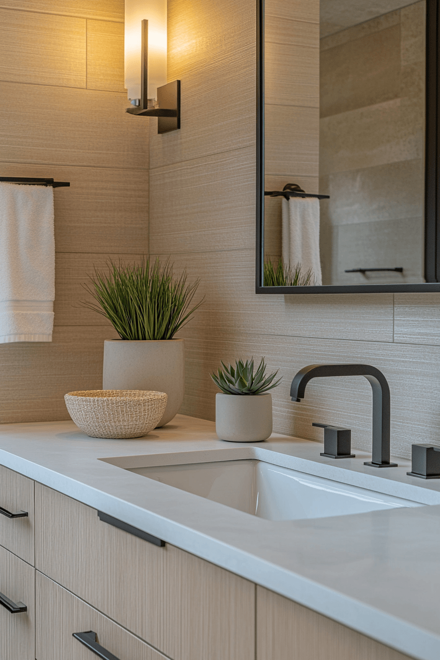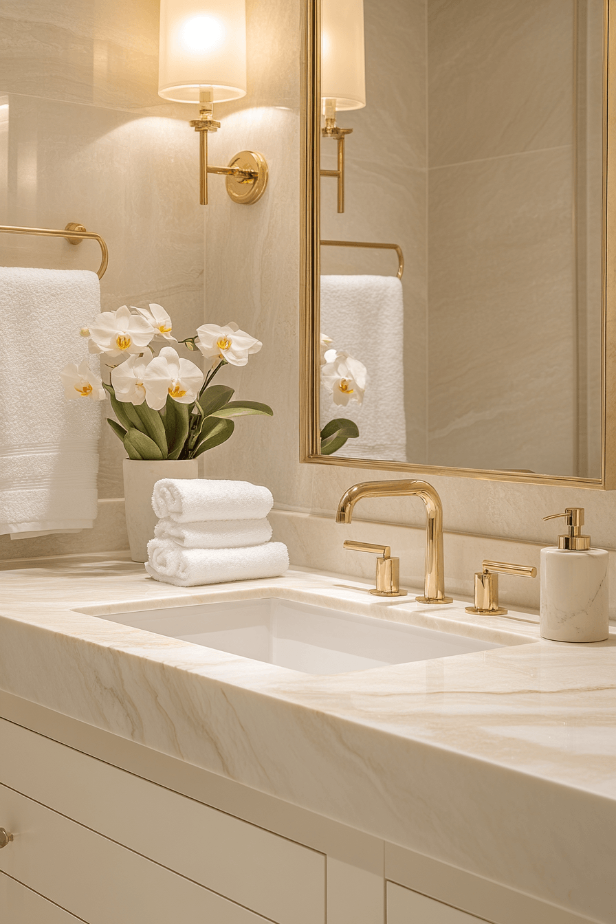 A warm neutral escape wraps guests in comfort with soft shades of beige, taupe, and natural wood accents. These guest bathroom ideas create a cozy yet refined environment that feels timeless and inviting. Subtle textures like stone tiles and brushed finishes add visual interest without overwhelming the design. The balanced palette keeps the space feeling calm and welcoming. It’s a perfect approach for creating a relaxing guest experience. Get inspired by more warm-toned guest bathroom ideas today.