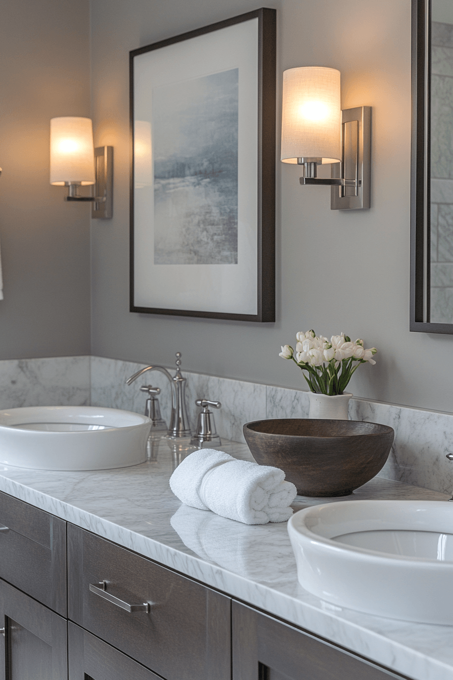A modern guest retreat showcases clean lines, uncluttered styling, and soothing tones that instantly elevate the space. These guest bathroom ideas focus on simplicity while still delivering a polished and welcoming feel. Floating vanities paired with sleek mirrors add a contemporary edge without overcrowding the room. The neutral palette keeps everything calm, airy, and easy on the eyes. It’s a versatile look that works beautifully in both small and spacious layouts. Dive into more modern guest bathroom ideas for a fresh, stylish upgrade.