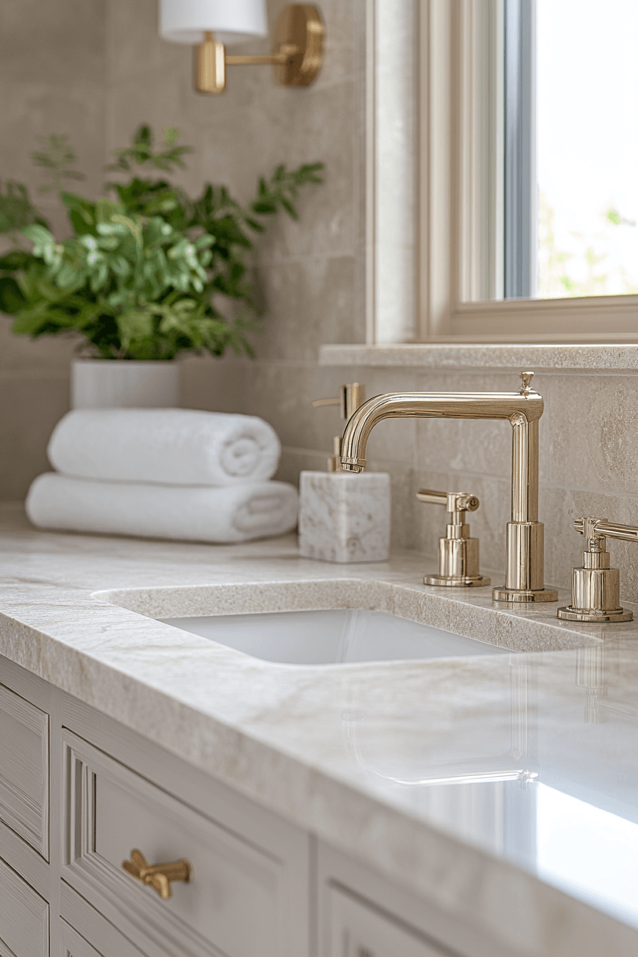 Stone-inspired surfaces bring a polished and natural elegance into the bathroom. These guest bathroom ideas feature materials like quartz and stone-look tiles for a durable yet luxurious finish. The textures add depth while maintaining a sleek appearance. Pairing them with wood or metallic accents creates a balanced, layered look. The overall feel is upscale yet welcoming. Take a look at more polished stone guest bathroom ideas for a refined touch.