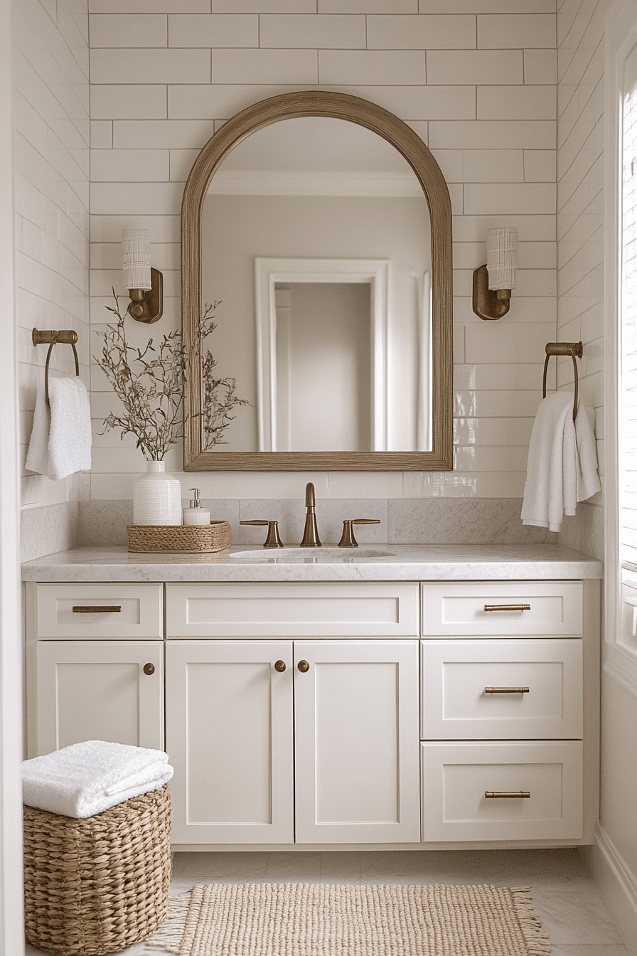 A standout mirror can instantly become the centerpiece of your bathroom design. These guest bathroom ideas use oversized shapes, unique frames, or bold silhouettes to draw attention and elevate the entire space. Beyond style, the mirror also reflects light and creates a sense of openness. It’s a quick yet impactful way to upgrade your bathroom without major changes. The effect feels both functional and visually striking. See how statement mirrors can transform your guest bathroom ideas into something unforgettable.