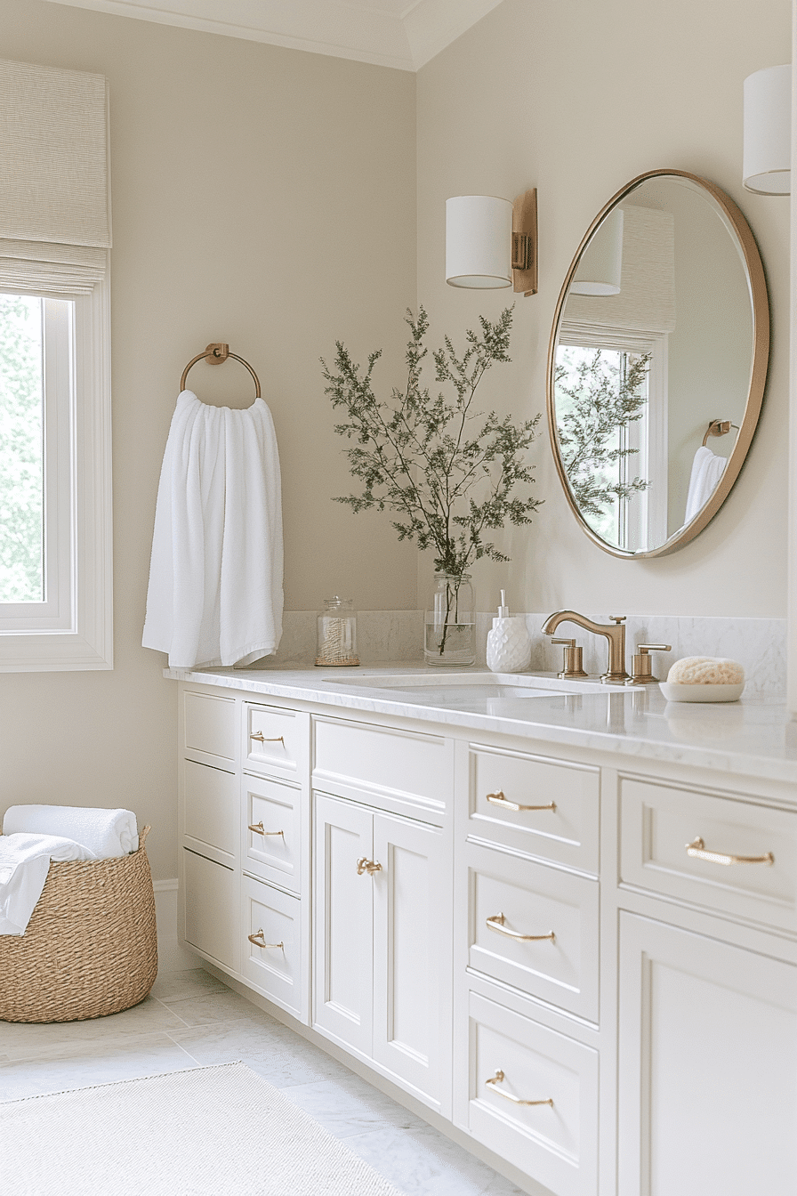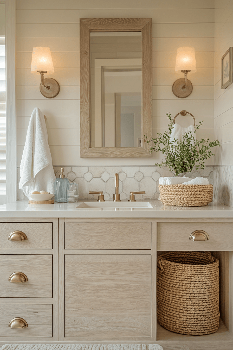 A soft beige bathroom delivers a timeless and calming aesthetic that never goes out of style. These guest bathroom ideas blend neutral hues with natural materials and warm metallic accents for a polished look. The gentle color palette creates a relaxing environment that feels both elegant and approachable. Soft lighting enhances the cozy atmosphere, making the space feel inviting. It’s a beautiful option for any size bathroom. Take a look at more beige-inspired guest bathroom ideas for a serene finish.