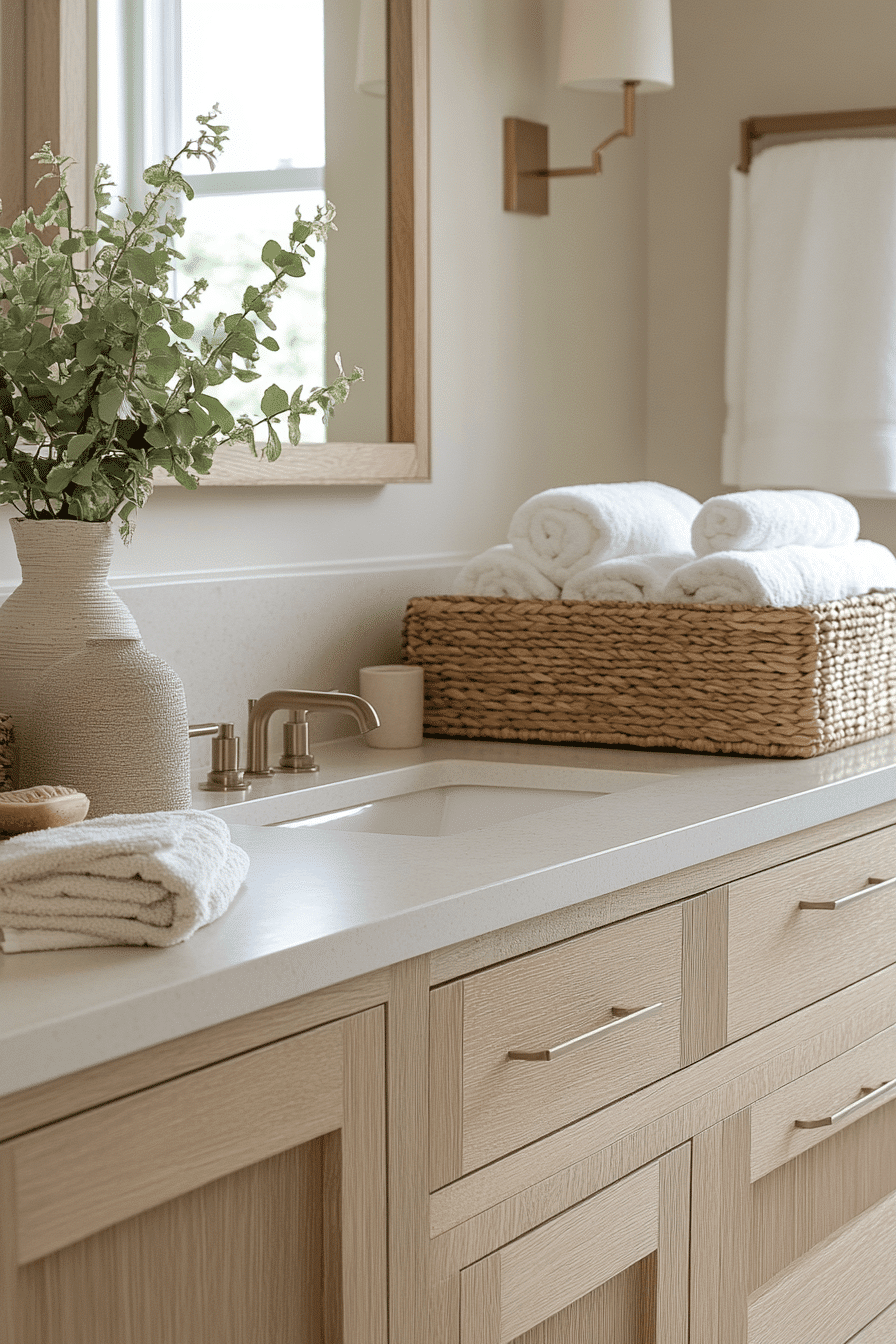 Soft light wood finishes instantly create a calm and grounded atmosphere that feels both modern and welcoming. These guest bathroom ideas pair beautifully with crisp white walls or neutral tiles for a clean, airy look. Wooden vanities and open shelving introduce warmth while keeping the space uncluttered. The overall design feels fresh, natural, and effortlessly stylish. It’s an easy way to bring subtle elegance into any home. Take a closer look at more light wood guest bathroom ideas for a soothing upgrade.