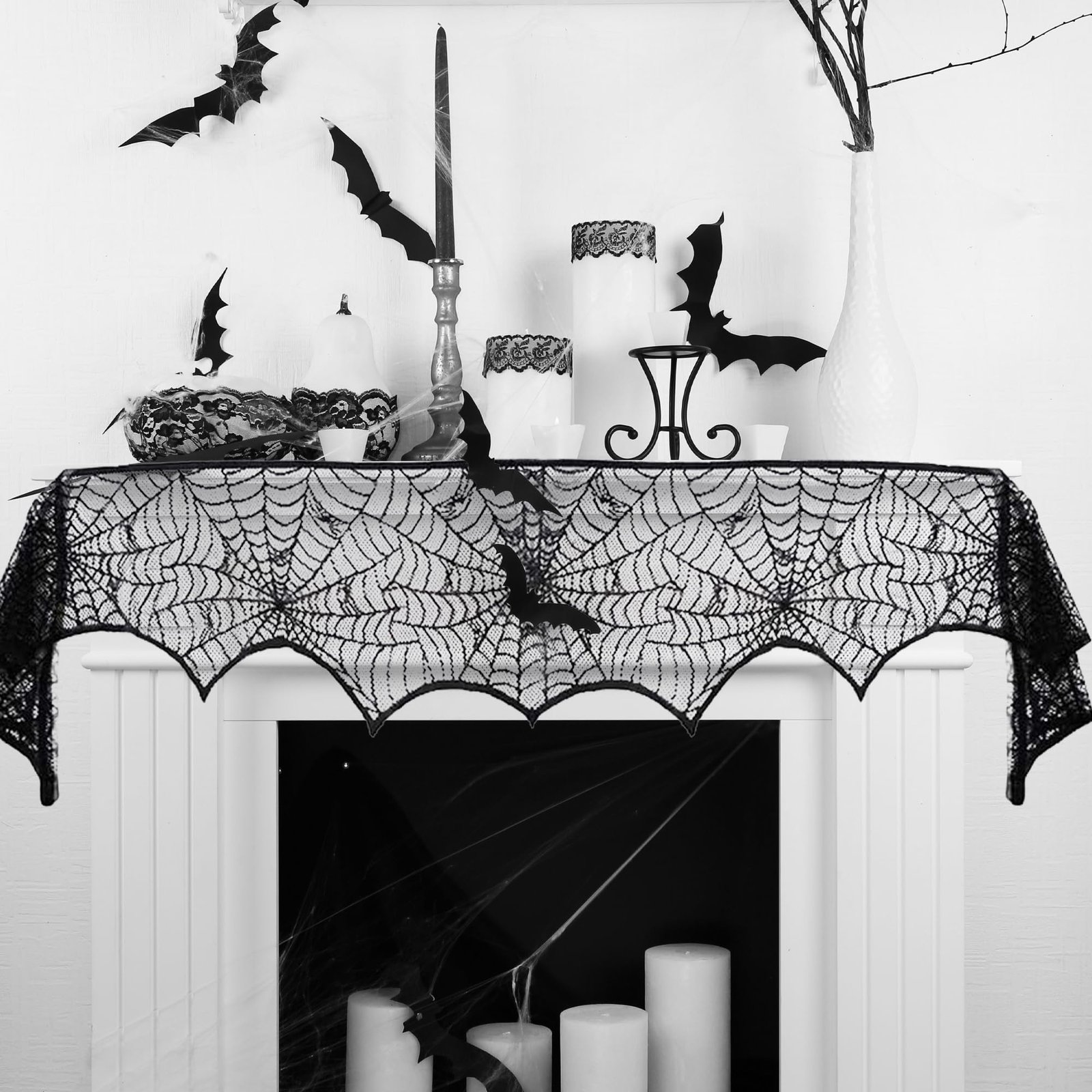 This spiderweb lace mantel scarf offers a simple and elegant way to add spooky charm to your fireplace or party space.