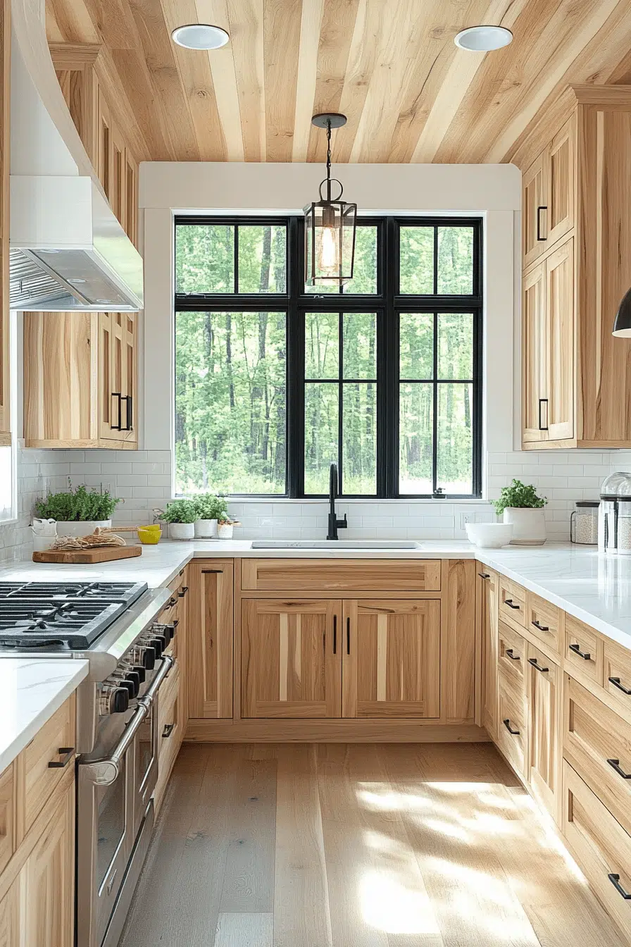 This kitchen proves that hickory cabinets can feel both rustic and refined when balanced with crisp white elements. The exposed wood ceiling creates a cohesive flow that makes the space feel warm yet sophisticated.