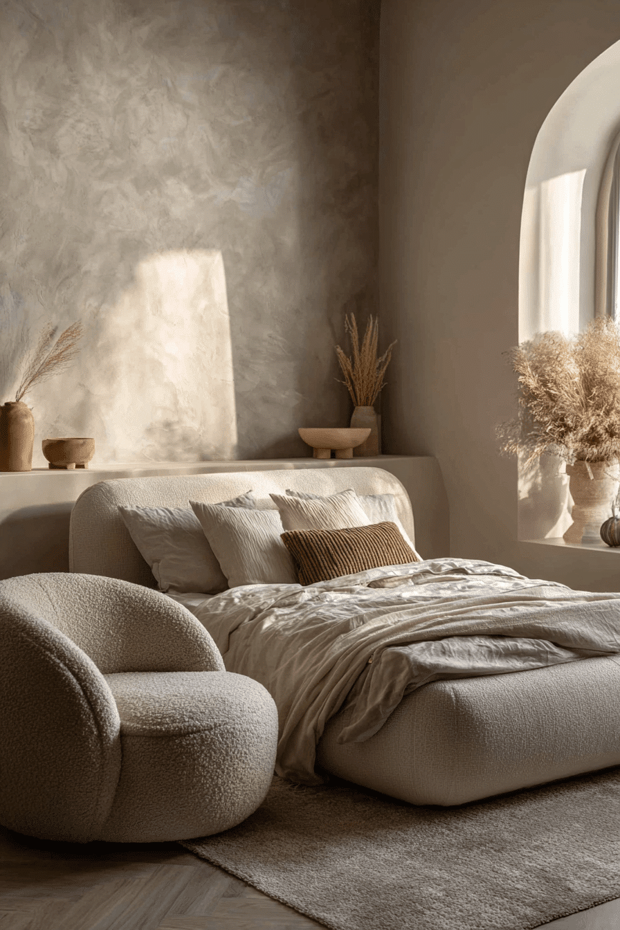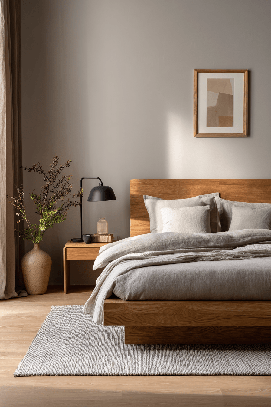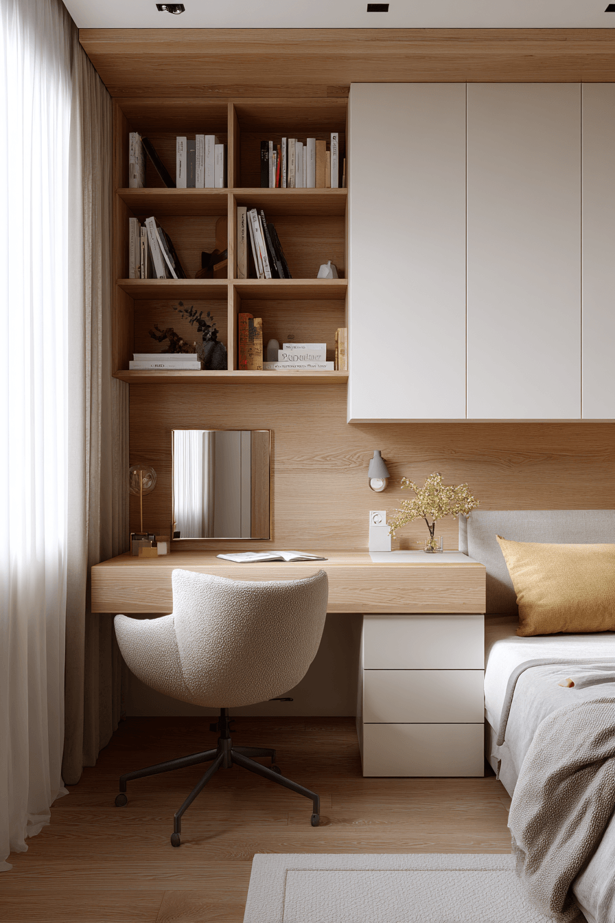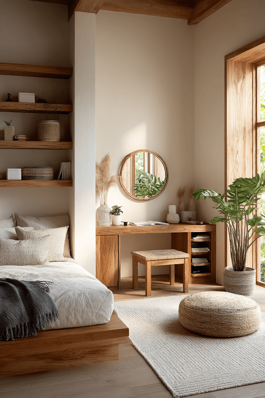 A japandi small bedroom can feel softer and more welcoming when gentle geometric shapes are introduced throughout the design. Rounded edges, curved furniture, and subtle patterns add a layer of comfort to the minimalist aesthetic. These shapes balance the clean lines, making the space feel more relaxed and approachable. The overall look stays modern while gaining a cozy touch. It’s a perfect blend of structure and softness. Click to uncover more japandi small bedroom ideas with soft geometry.