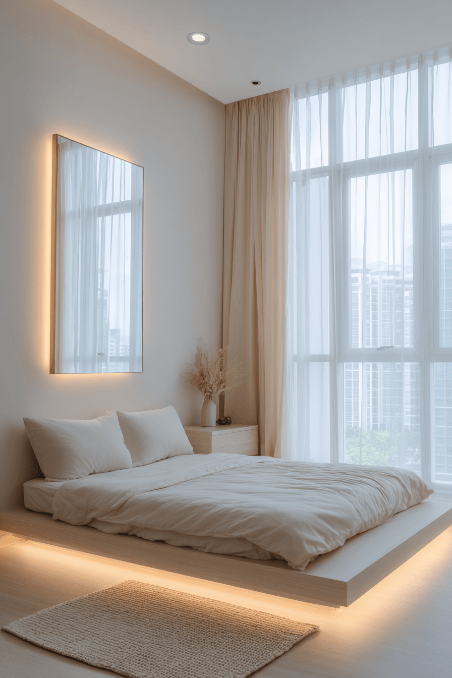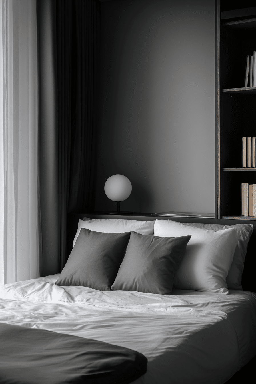 Playing with light and shadow, a japandi small bedroom can feel visually dynamic without adding extra clutter. Strategic lighting paired with a monochrome palette creates soft contrasts that add depth and interest. Shadows become part of the design, giving the space a modern and artistic feel. The minimalist setup keeps everything clean and intentional. It’s a smart way to make a small room feel more expressive. Click to discover more japandi small bedroom inspiration with dramatic lighting.