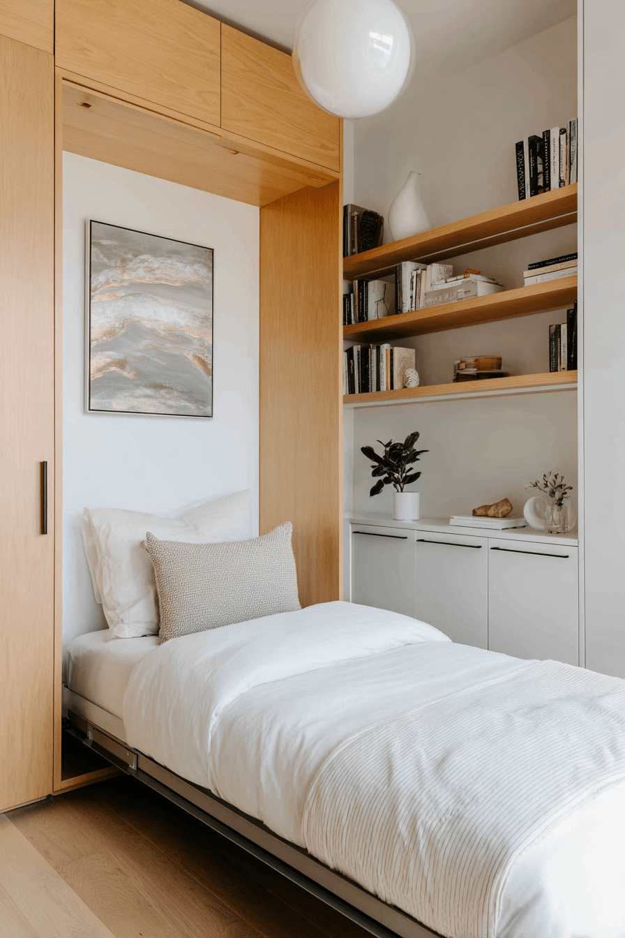 Bringing a subtle sense of adventure into a japandi small bedroom can add personality without overwhelming the design. Muted artwork, soft map prints, and understated travel-inspired accents create interest while keeping the space calm. The minimalist foundation ensures everything feels balanced and refined. It’s a fun yet sophisticated way to spark creativity in a small room. The result feels unique while still maintaining a peaceful atmosphere. Click to discover more japandi small bedroom inspiration with a creative twist.