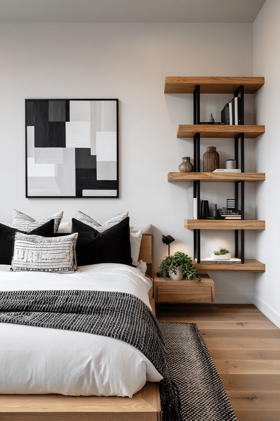 A japandi small bedroom can feel effortlessly chic with a monochrome palette that blends black, white, and soft gray tones. This simple color approach creates a clean, unified look that visually opens up the space. Without bold colors competing for attention, the room feels calm and more expansive. The minimalist styling keeps everything sleek and modern. It’s perfect for anyone who loves a polished, clutter-free aesthetic. Tap to explore more japandi small bedroom ideas with a monochrome vibe.