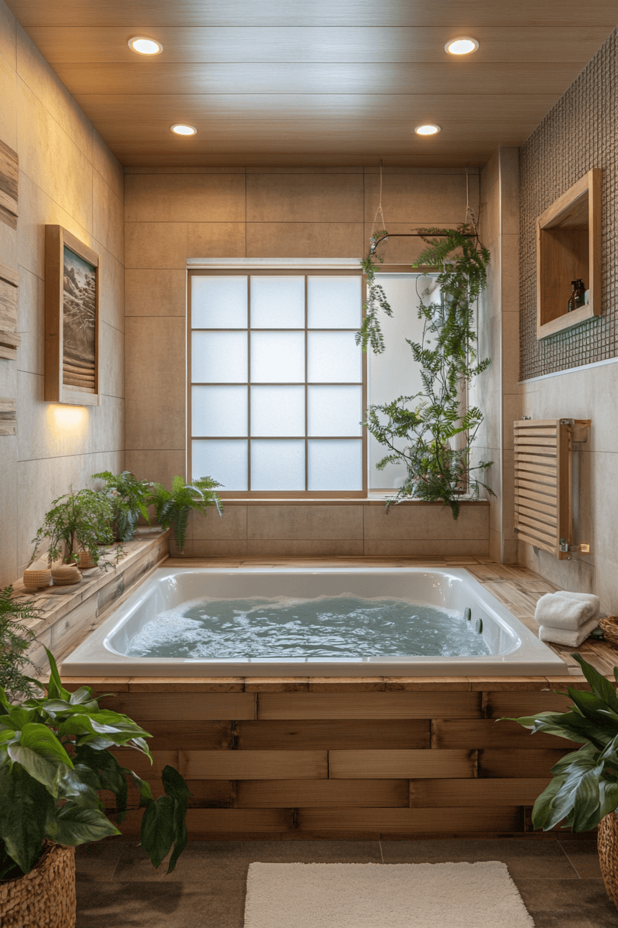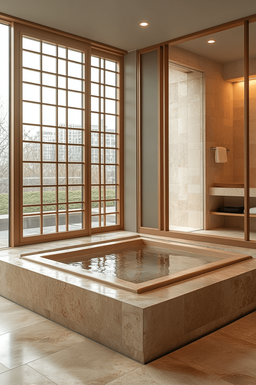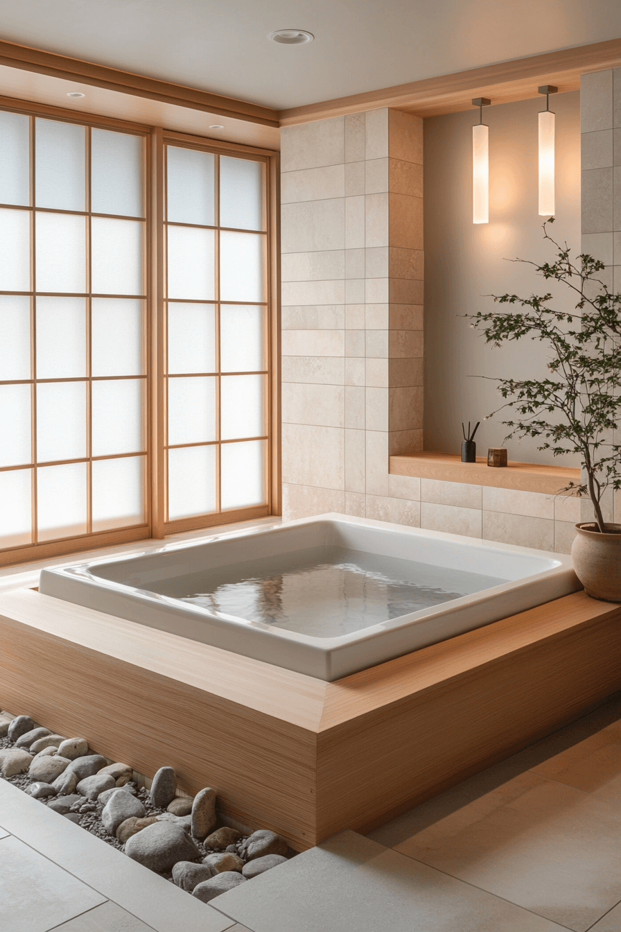 A spa-inspired japanese bathroom can recreate the soothing feeling of a natural hot spring right at home. A deep soaking tub becomes the centerpiece, surrounded by stone textures and warm wood for an organic, relaxing feel. Gentle steam and soft lighting enhance the calming ambiance, making every bath feel like a luxury escape. The sound of water adds a peaceful sensory layer that completes the experience. It’s a design that encourages total relaxation and renewal. Discover how to bring this japanese bathroom retreat to life.