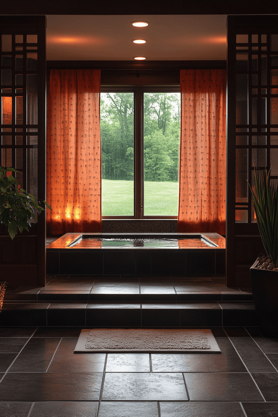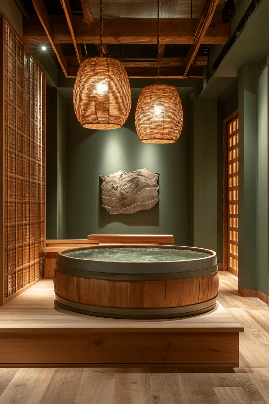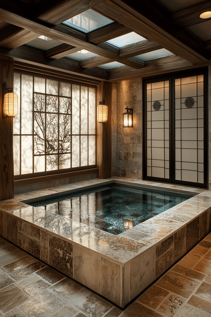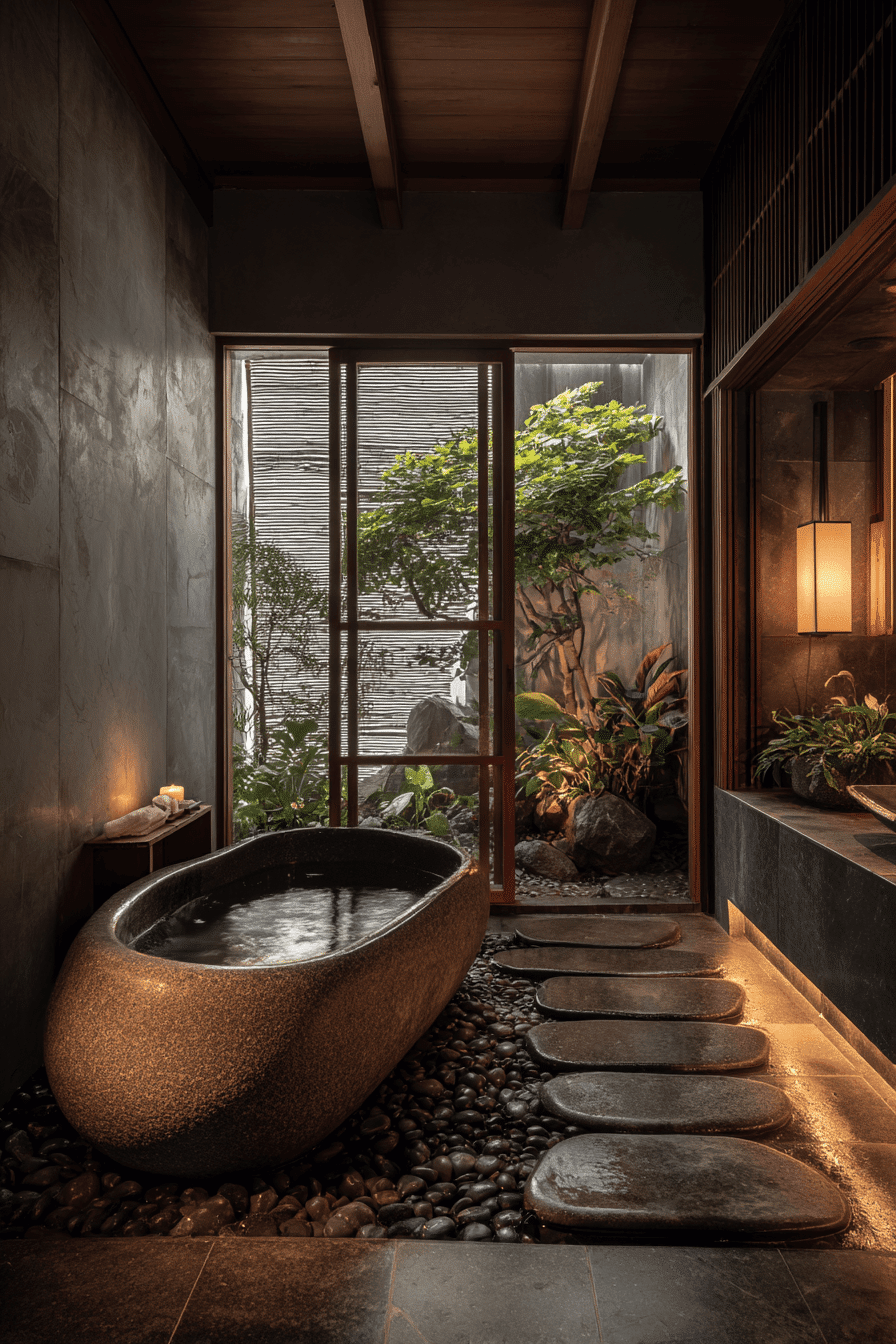 A beautifully styled japanese bathroom can glow with warmth when lantern-inspired lighting is used to create a soft, inviting ambiance. The gentle illumination highlights rich textures like polished stone and smooth wood, adding depth and elegance. Hanging lantern fixtures double as statement pieces, giving the space a refined yet calming presence. The mix of traditional lighting with luxurious materials feels both timeless and elevated. It’s the perfect way to design a space that feels cozy and sophisticated at once. Tap to explore more japanese bathroom ideas with ambient lighting.