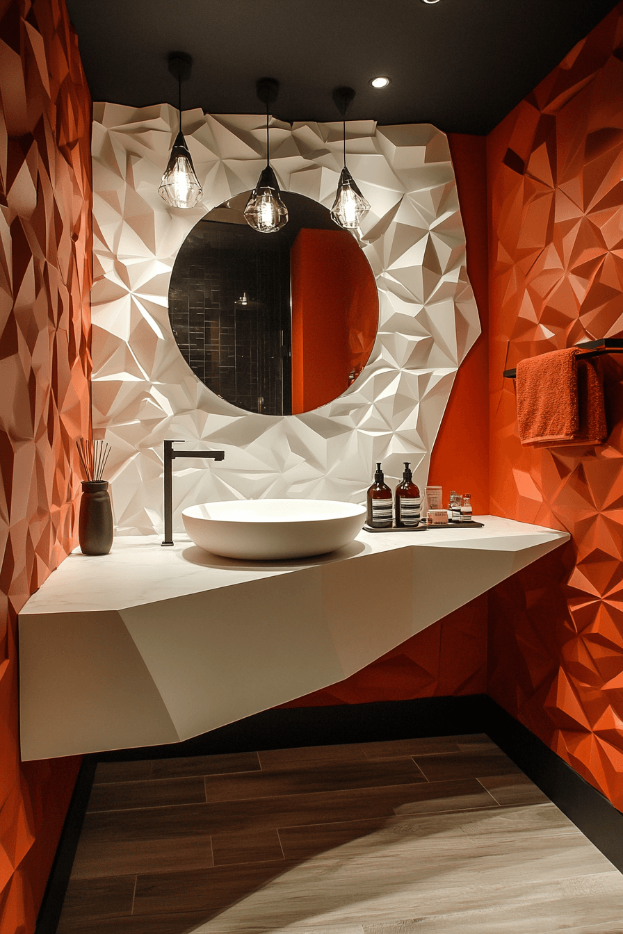 Get inspired by this modern artistic **japanese bathroom** that reflects the precision and beauty of origami! Sharp lines and geometric details create such a striking visual impact that’s both creative and calming. Clean angles and structured fixtures paired with a refined color palette feel so polished and contemporary. Thoughtful storage solutions keep everything sleek and clutter-free, enhancing that beautiful minimalist aesthetic. The combination of art and function makes this space truly eye-catching and unique. Explore more **japanese bathroom** ideas with this bold geometric twist!