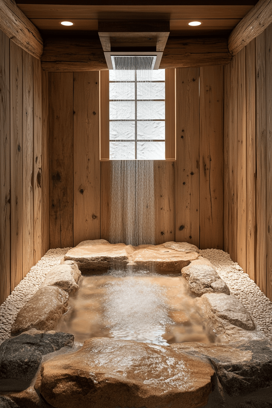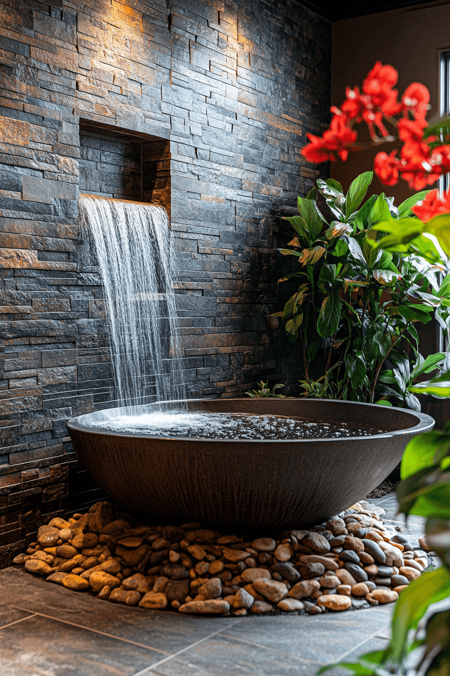 A refreshing japanese bathroom can capture the soothing movement of a natural waterfall through calming water features. Cascading water flowing over textured stone creates both visual beauty and a peaceful soundscape. The combination of natural materials and gentle motion adds depth and tranquility to the space. It feels like stepping into a serene outdoor escape without leaving your home. This design is perfect for creating a relaxing, spa-like environment. Explore more japanese bathroom ideas inspired by flowing water.