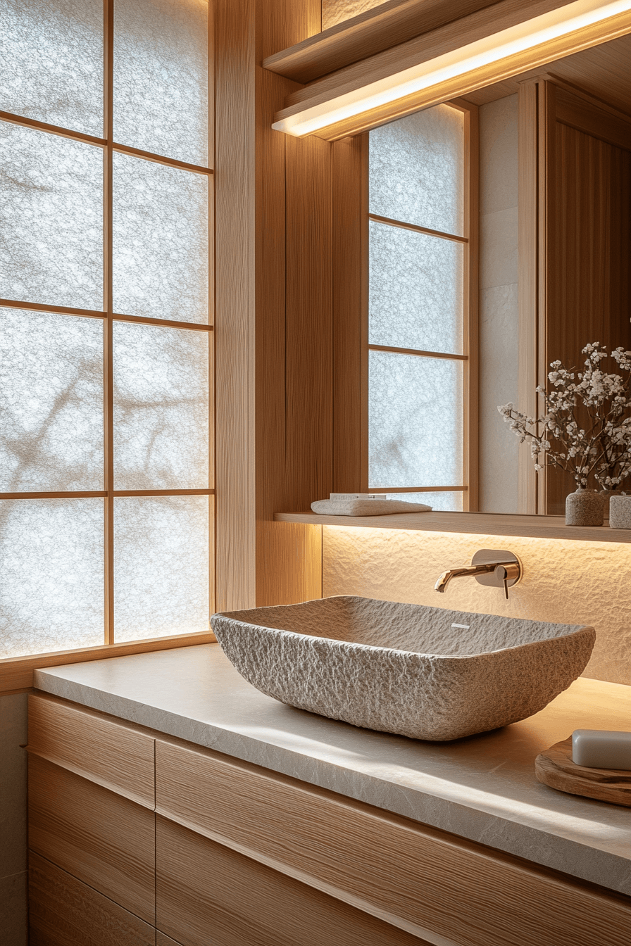 Float away in the soft beauty of this elegant **japanese bathroom** featuring delicate paper-style panels! These gorgeous features gently filter sunlight, filling the room with the most warm and calming glow. Natural wood frames paired with simple stone accents complete the look with such subtle sophistication. The design feels wonderfully airy, light, and incredibly peaceful throughout. This is the perfect choice for creating a serene everyday escape right at home. Click to uncover more **japanese bathroom** designs with these beautiful soft lighting details!