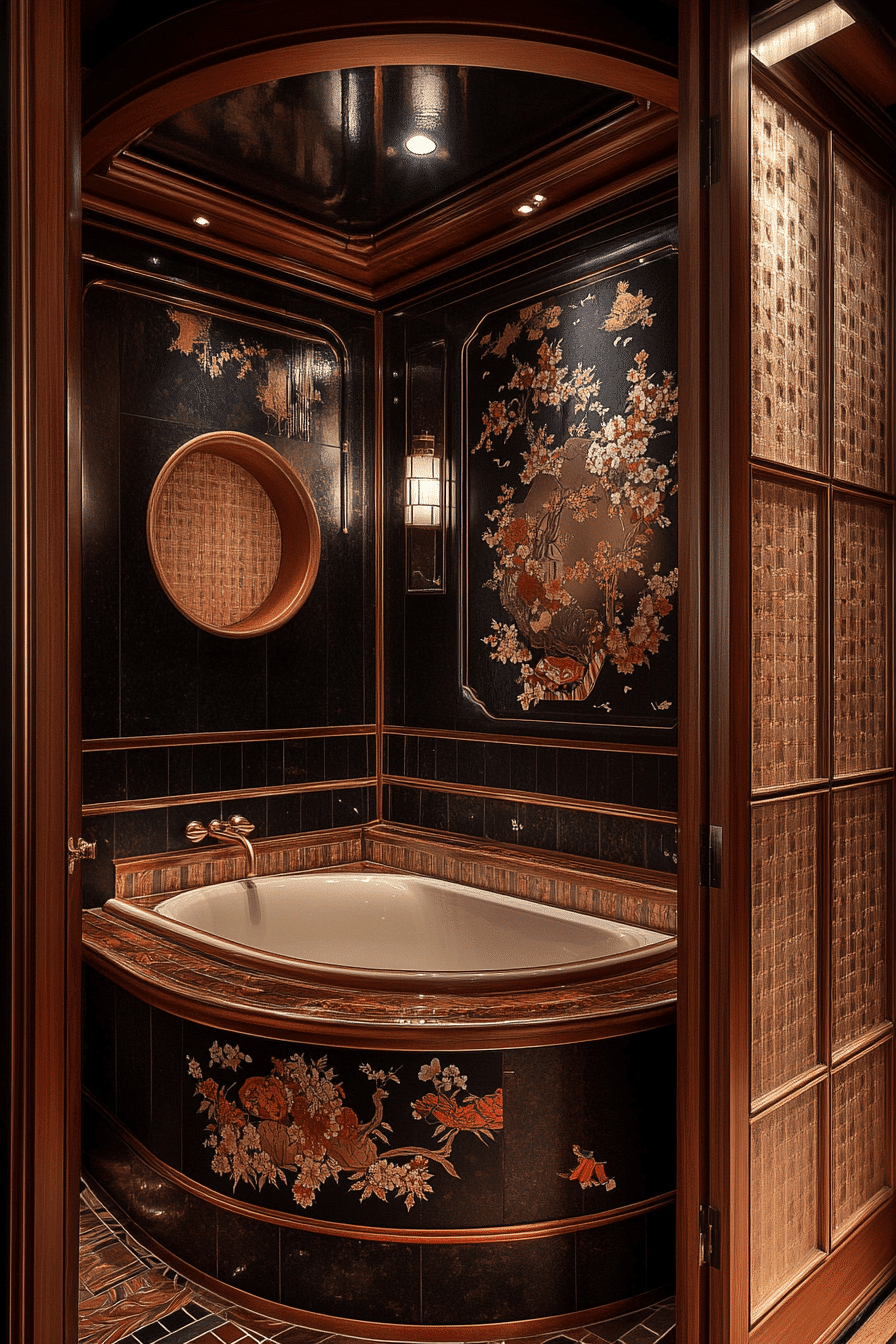 A luxurious japanese bathroom can channel the elegance and artistry of traditional Geisha culture through rich textures and refined details. Silky fabrics, gold accents, and intricate patterns create a visually stunning space that feels both glamorous and serene. A deep soaking tub paired with decorative wooden screens adds depth and sophistication. Soft lighting enhances every detail, giving the room a warm, inviting glow. The overall atmosphere feels indulgent yet calming at the same time. Tap to discover more japanese bathroom ideas with a glamorous twist.