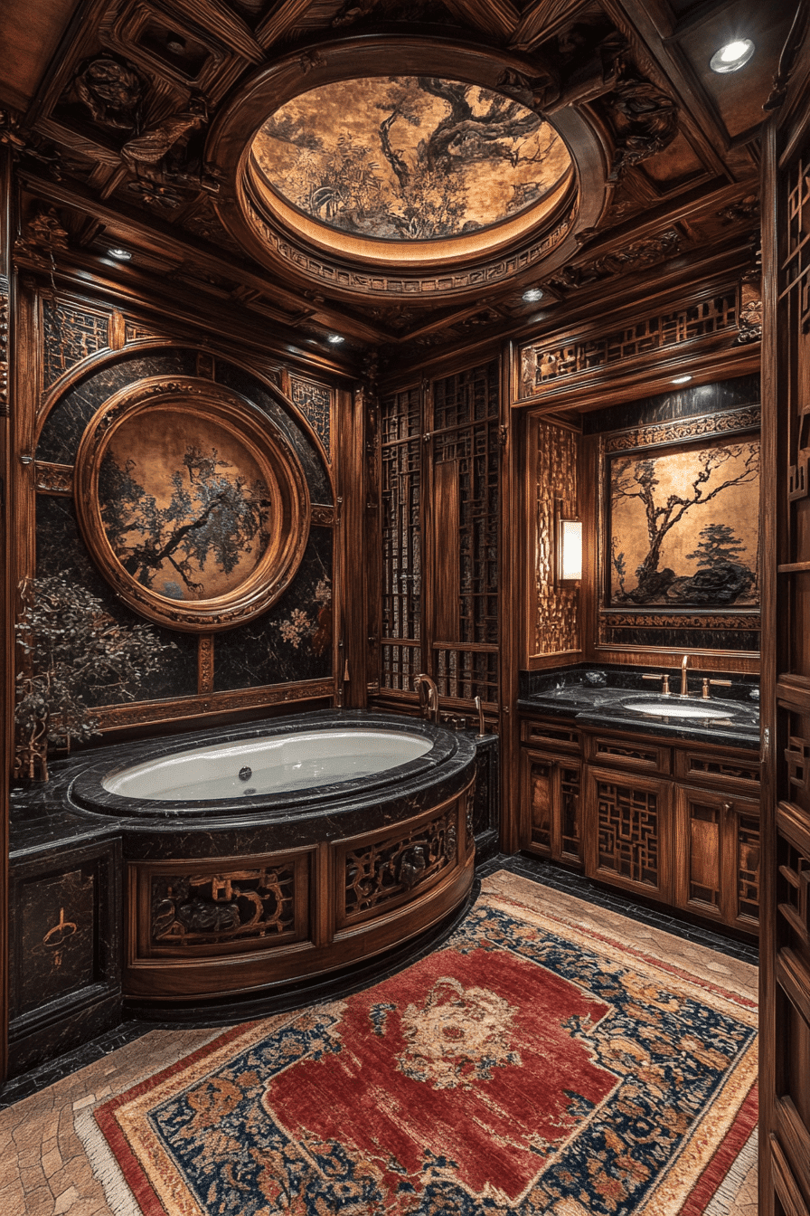 An opulent japanese bathroom can reflect the grandeur of imperial-inspired interiors with rich materials and refined craftsmanship. Elegant carvings, soft fabrics, and gold details create a regal atmosphere that feels elevated and luxurious. Spacious layouts and high-end fixtures ensure comfort while maintaining a polished aesthetic. Every detail is thoughtfully designed to feel both functional and breathtaking. The result is a space that feels like a personal retreat fit for royalty. Discover more japanese bathroom ideas that bring luxury to life.