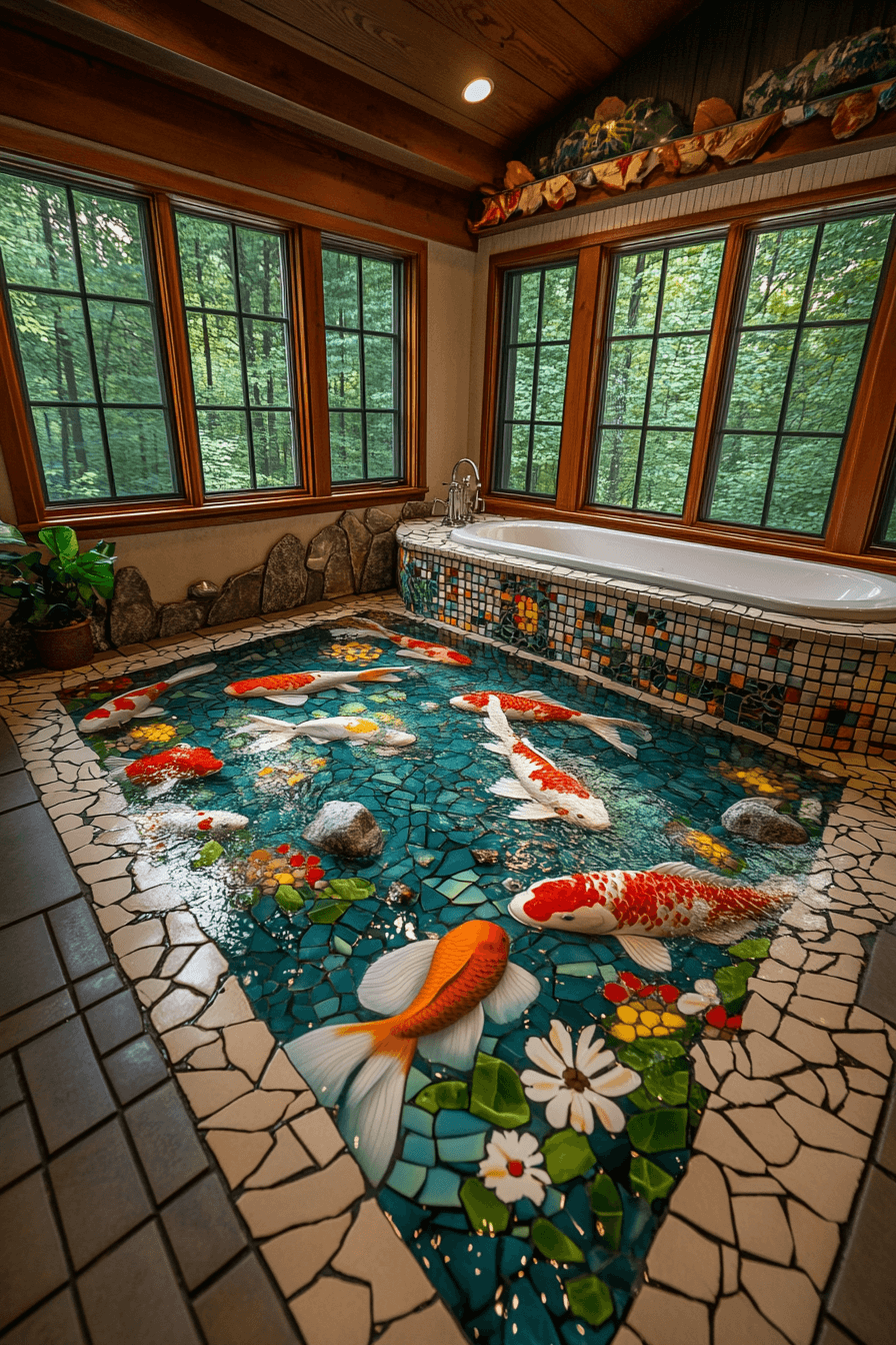 A unique japanese bathroom can take inspiration from the calming beauty of a koi pond. Artistic tile details and flowing design elements mimic the look of water, adding a tranquil and creative touch. Natural stone textures and gentle lighting enhance the peaceful vibe. The overall effect feels like stepping into a serene garden escape. Every detail is designed to soothe and inspire. Explore more creative japanese bathroom ideas today.