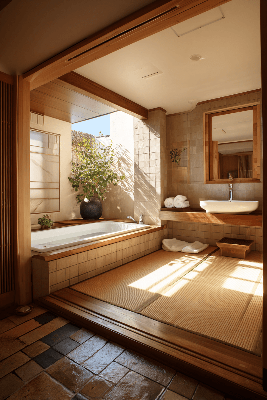 A cozy japanese bathroom can feel instantly inviting when tatami-inspired textures are thoughtfully added underfoot or along accent areas. The natural fibers bring warmth and a soft, grounding feel that enhances everyday routines. Paired with calming earth tones and simple materials, the space feels balanced and deeply relaxing. This approach blends tradition with comfort in a way that feels both unique and timeless. It’s a beautiful way to create a culturally rich and soothing retreat. Tap to uncover more japanese bathroom ideas with tatami touches.