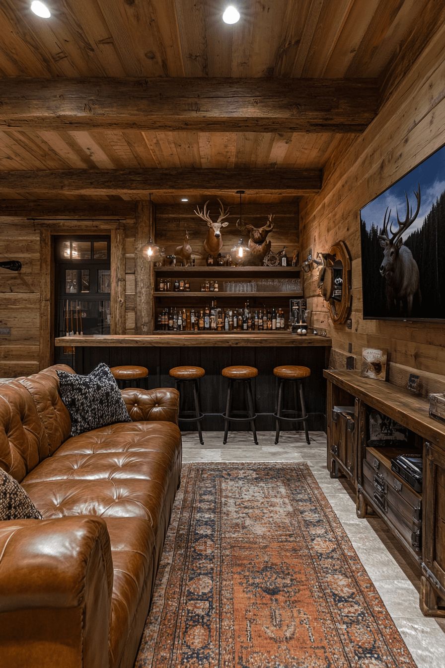 Little cabin decor with a masculine twist comes alive in the lumberjack lounge—a mix of rugged comfort and style. Leather seating, plaid patterns, and heavy timber accents create a rich, inviting atmosphere. Framed maps, vintage tools, and warm lighting add personality and depth. The overall effect is both bold and cozy.