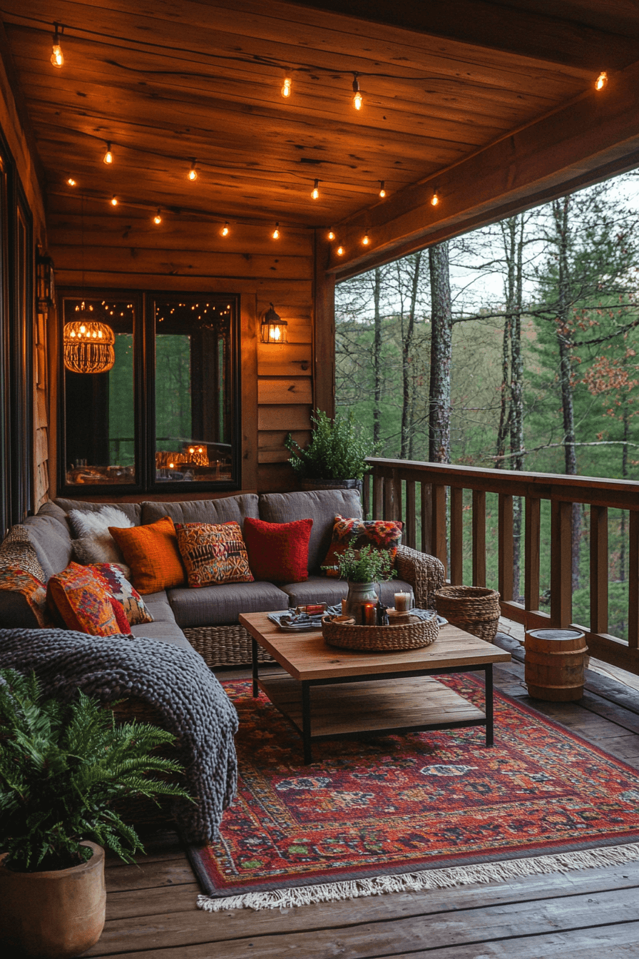 Enjoy the outdoors in style with little cabin decor that enhances al fresco living. Decks and patios come alive with weather-resistant furniture, string lights, and soft rugs. A cozy fire pit turns evenings into magical gatherings under the stars. Plants and flowing drapes add charm while blending indoor comfort with outdoor beauty.