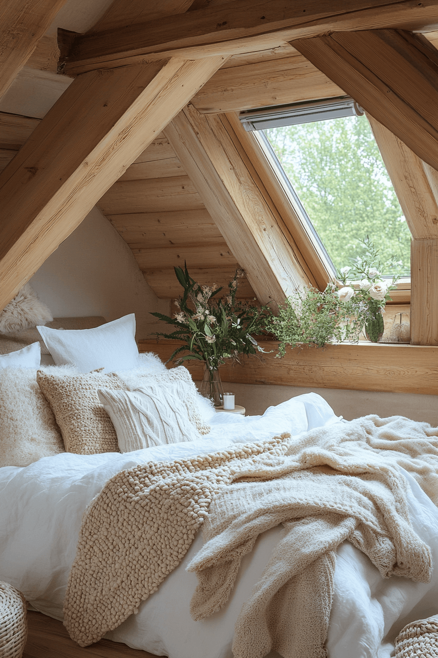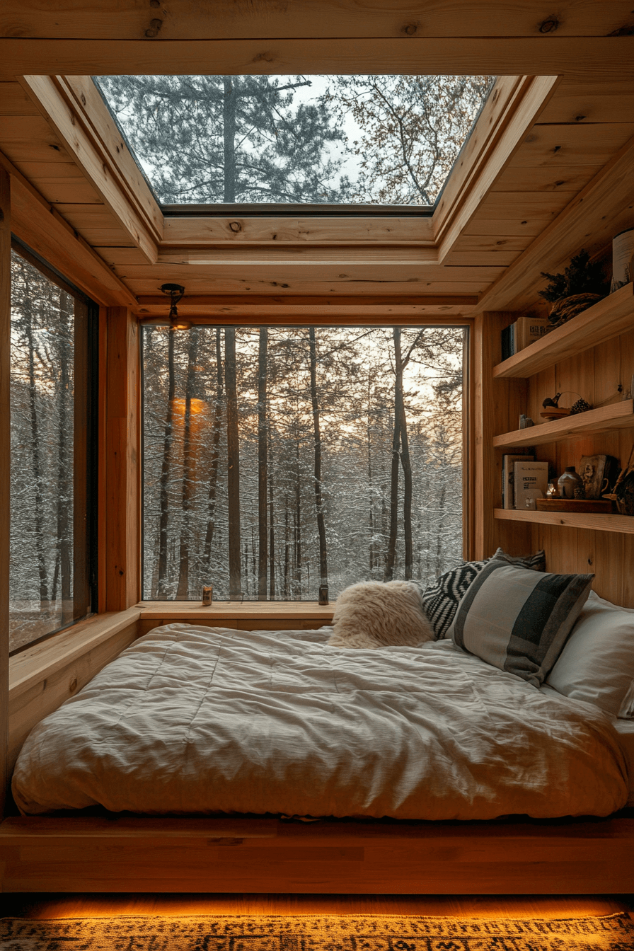 Maximize every inch of your space with little cabin decor that transforms lofts into luminous escapes. Skylights and big windows fill the area with natural light and warmth. Minimal furniture keeps the space open and inviting. Add soft rugs and floor cushions for an extra dose of comfort.