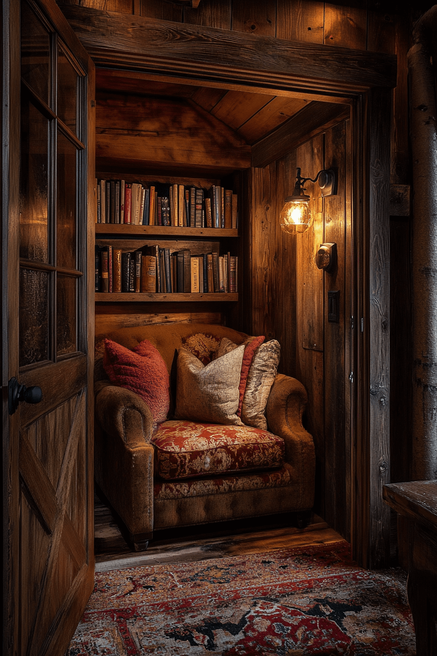 Turn quiet corners into secret sanctuaries with little cabin decor that celebrates hidden havens. Concealed doors, loft nooks, or tucked-away alcoves create cozy escapes within your home. Soft lighting and warm fabrics make them perfect for reading or recharging. It’s the ultimate personal retreat for peace and comfort.