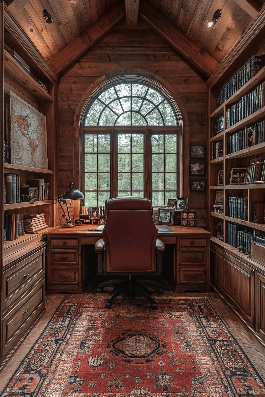 Create a focused, inspiring space with little cabin decor that brings rustic charm into your study. A wooden desk, classic lamp, and a view of the woods set the perfect tone for productivity. Shelves filled with books and nature accents spark creativity. The balance between work and comfort feels effortless.