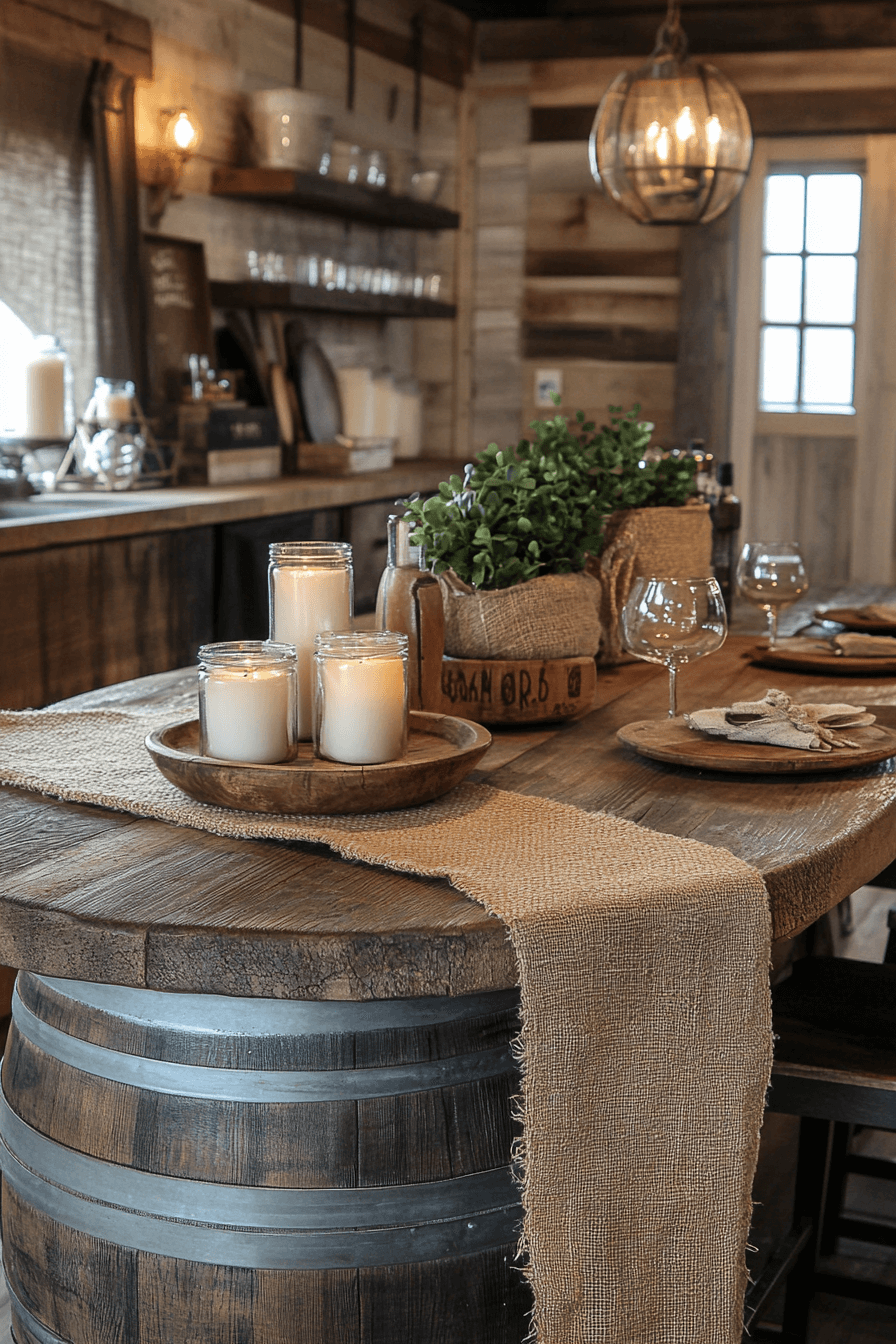 Sustainability meets creativity in little cabin decor that features barrels and burlap. Repurposed barrels as tables and burlap textiles bring rustic authenticity to your space. Each element feels down-to-earth yet artistic. The result is a look that’s both eco-friendly and effortlessly stylish.