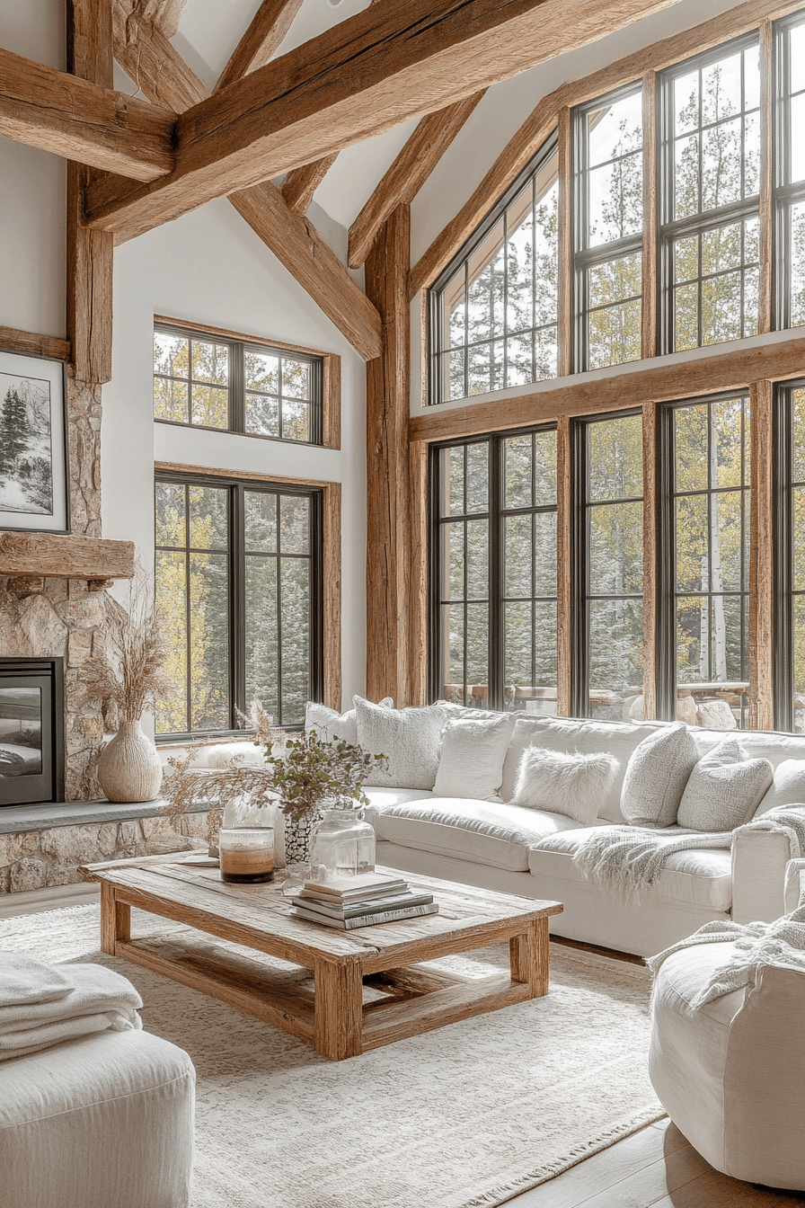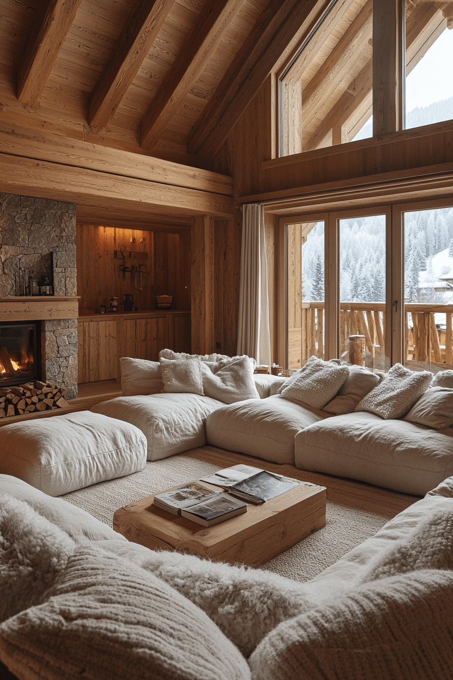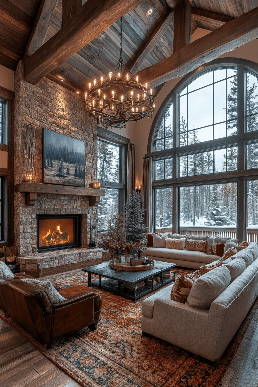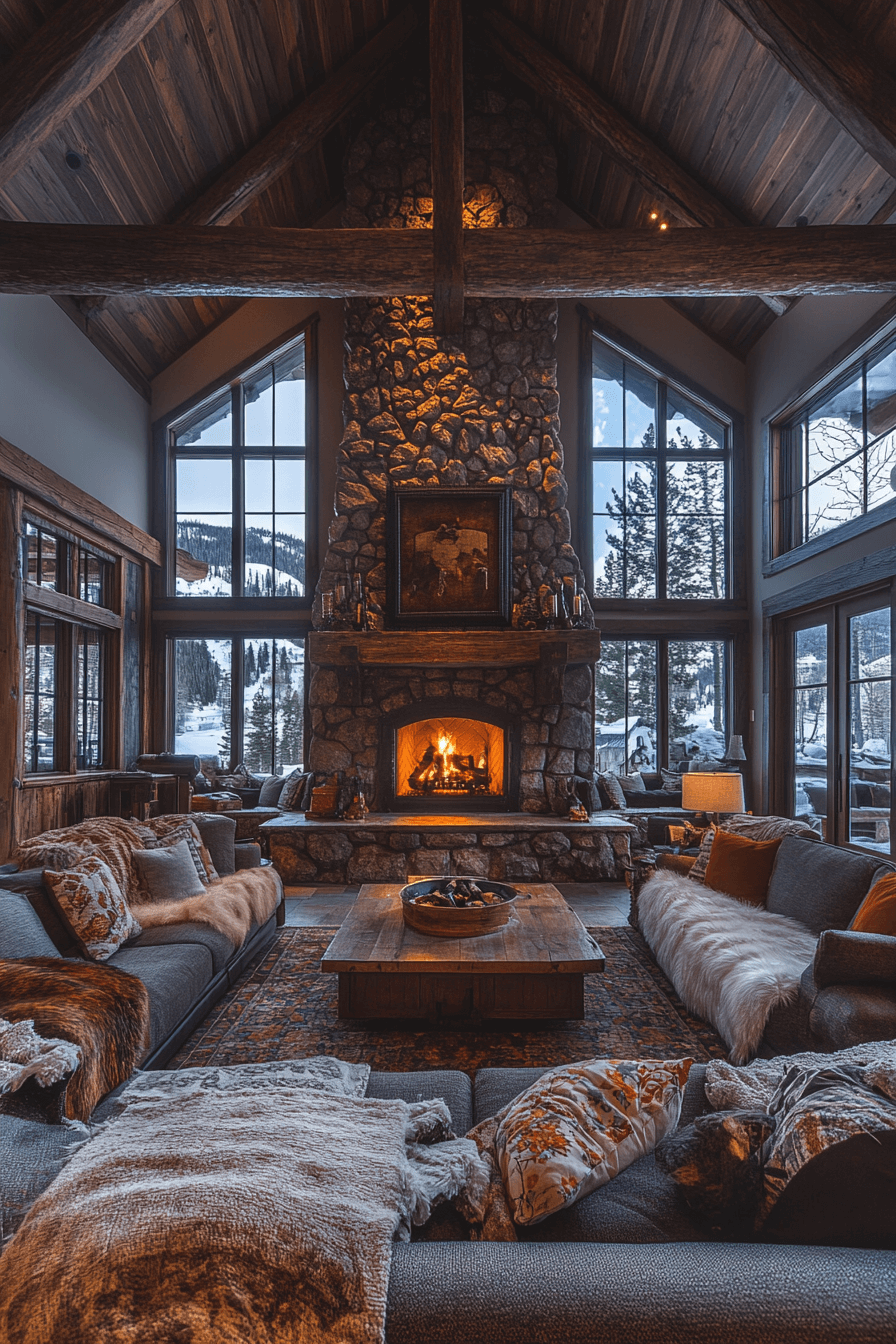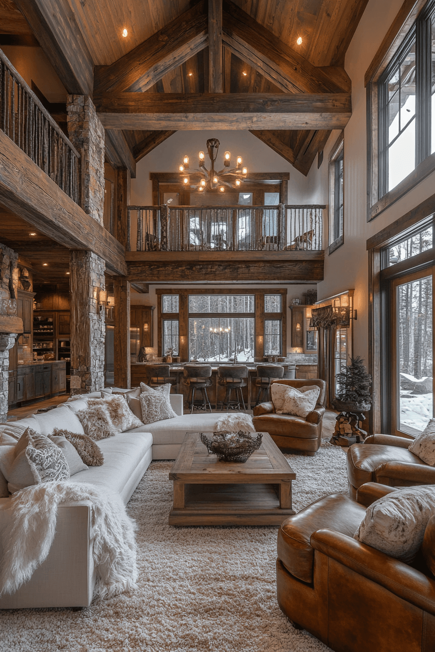 Elegance meets rustic charm in this little cabin living room, where refined furnishings and natural textures blend beautifully. Wooden beams and stone details pair with soft fabrics and warm light. The palette of creams and tans feels sophisticated yet relaxed. It’s mountain luxury with a timeless twist.