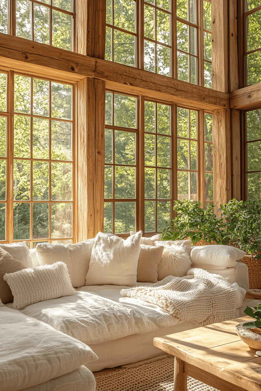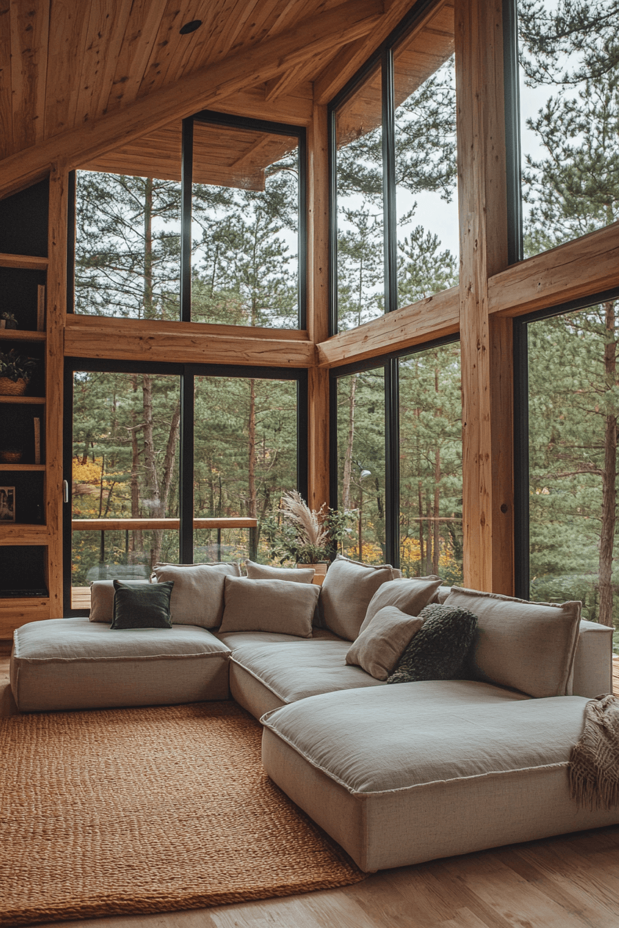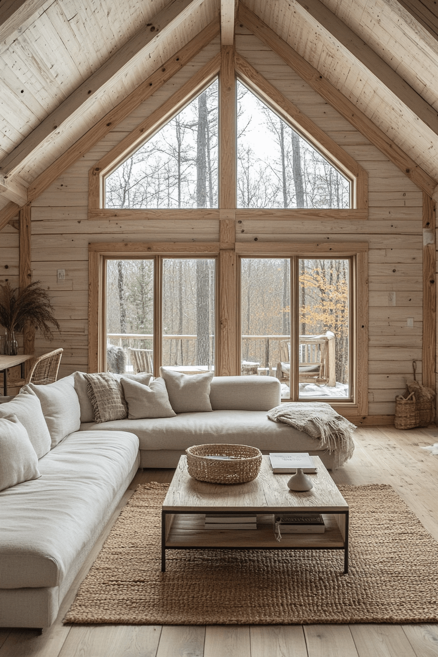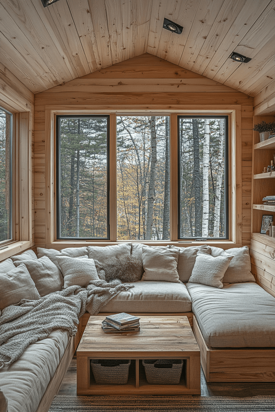 This sun-filled little cabin living room captures the beauty of daylight with wide windows and soft, neutral furnishings. Natural wood tones ground the bright, airy space. Cozy seating and subtle décor make it perfect for unwinding with a view. Every moment feels peaceful and refreshing.