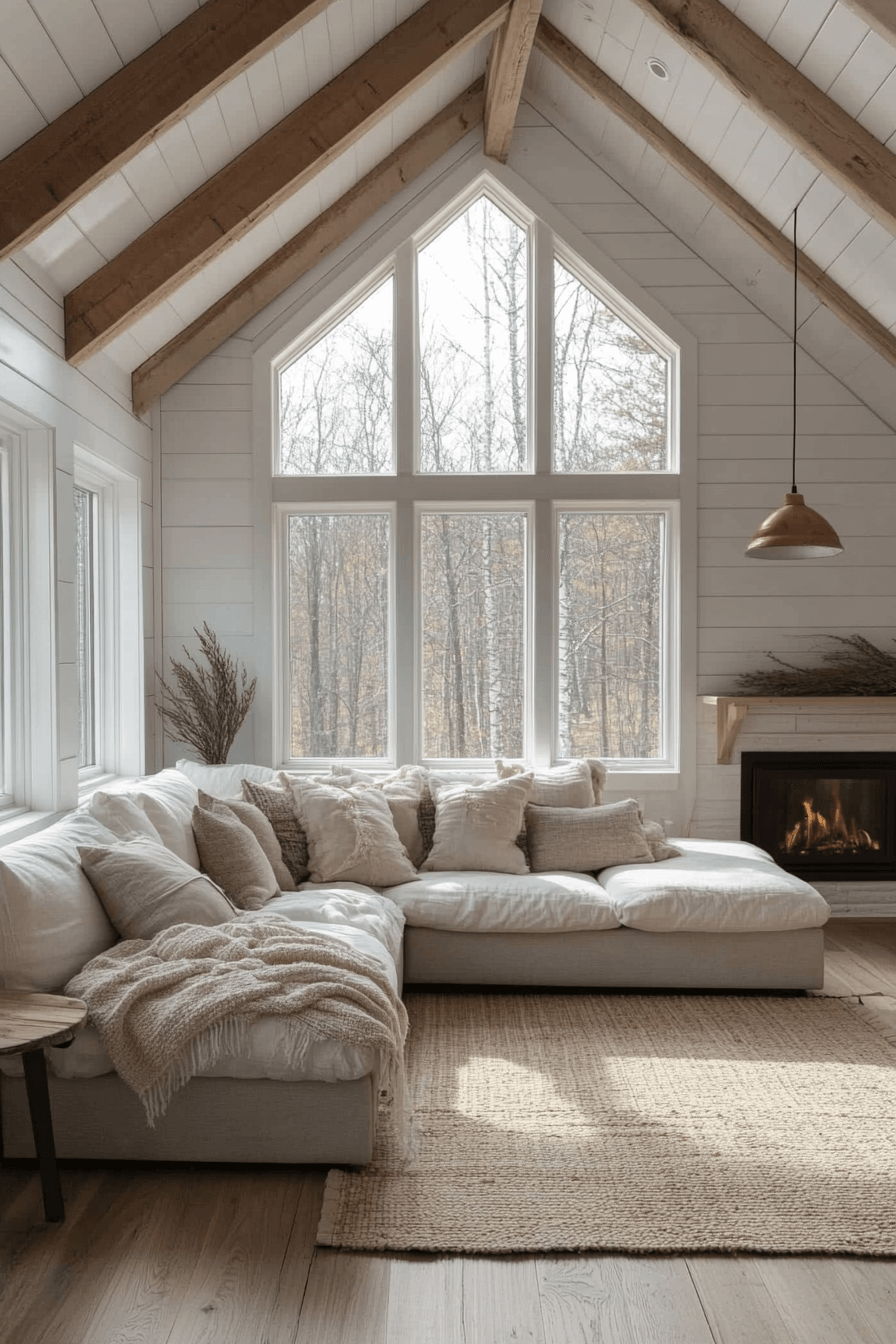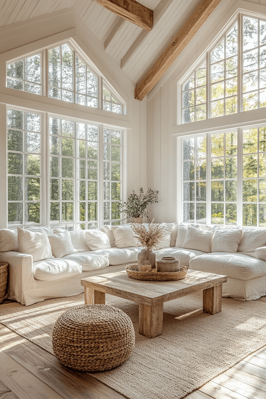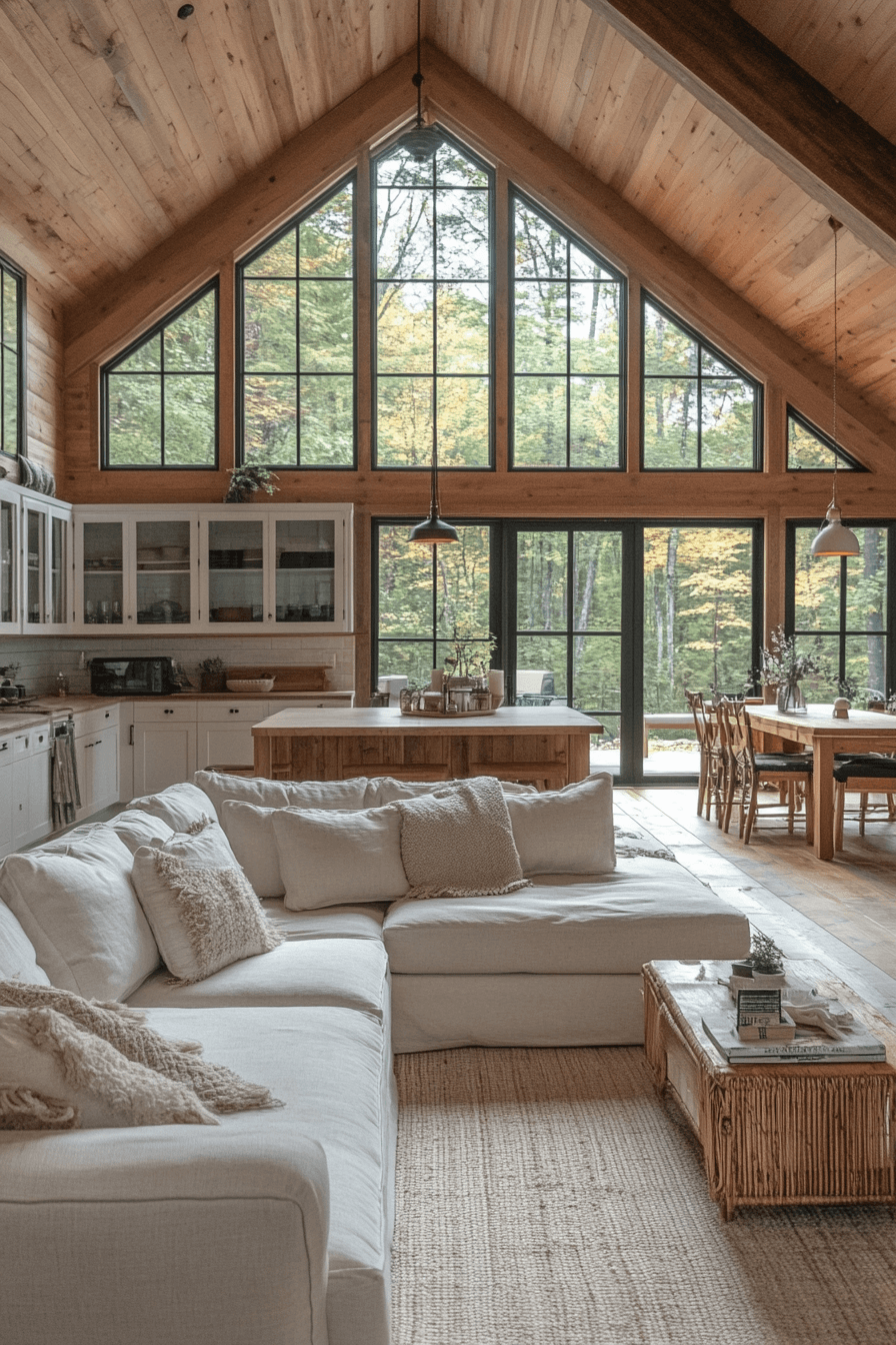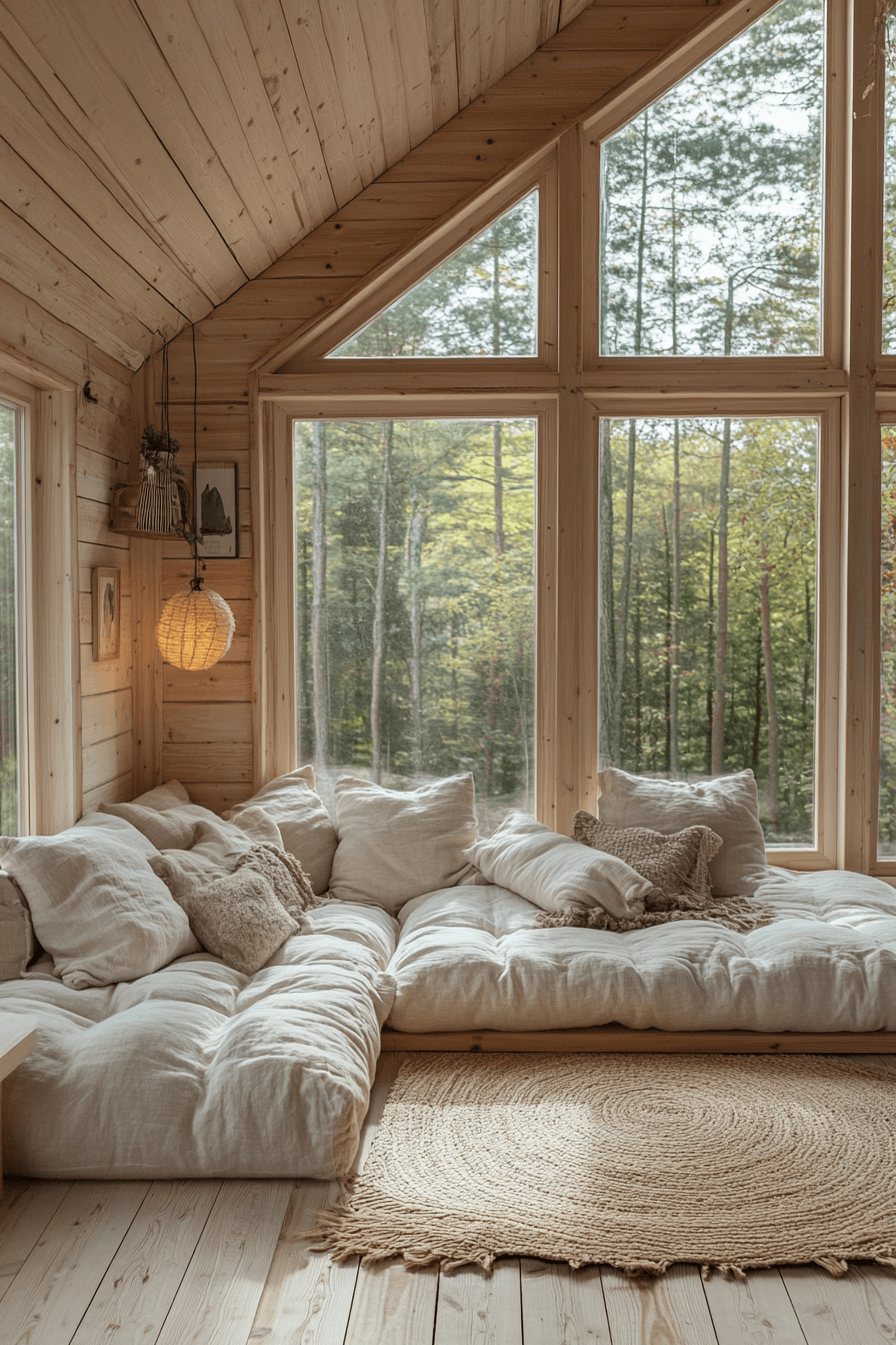 This sun-filled little cabin living room captures the beauty of daylight with wide windows and soft, neutral furnishings. Natural wood tones ground the bright, airy space. Cozy seating and subtle décor make it perfect for unwinding with a view. Every moment feels peaceful and refreshing.