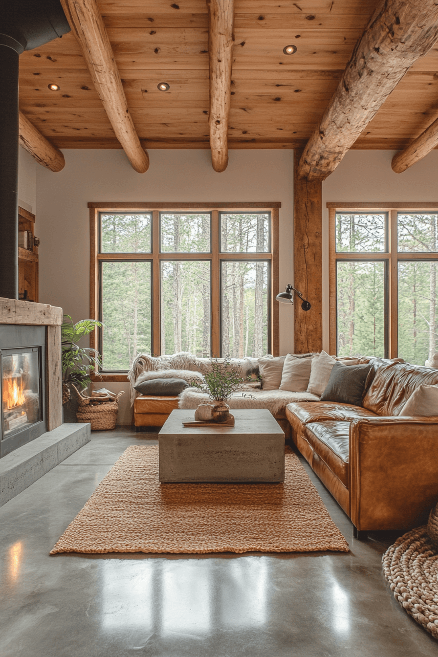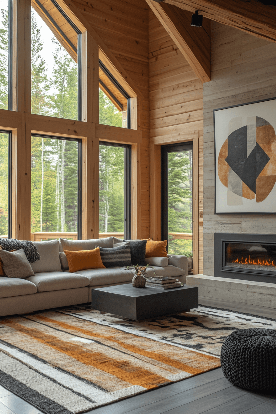 Modern and rustic blend effortlessly in this stylish little cabin living room that feels both fresh and cozy. Clean lines and minimal décor highlight the beauty of natural materials. Large windows brighten the space and frame stunning outdoor views. It’s the perfect harmony of nature and contemporary comfort.