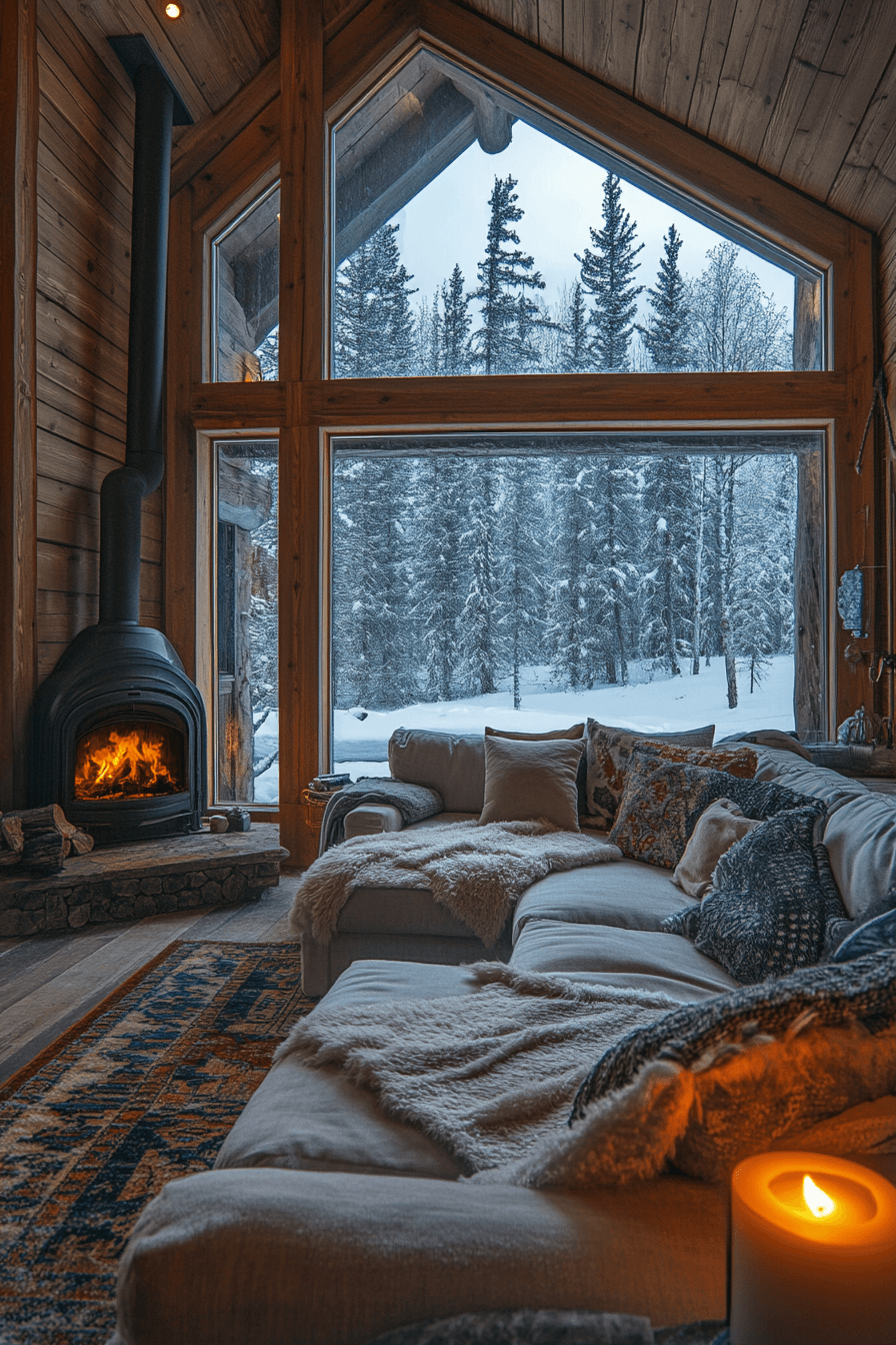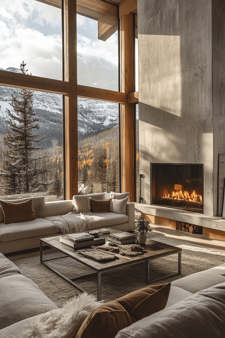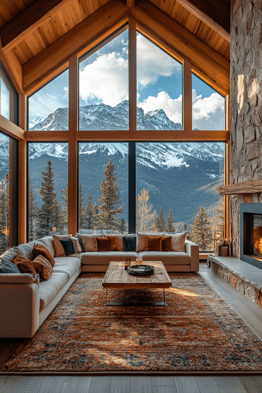 Floor-to-ceiling windows bring the outdoors in, turning this little cabin living room into an alpine dreamscape. The mountain views become part of the décor, framed by natural wood and cozy seating. Low-profile furniture ensures nothing distracts from the scenery. Soft textures and subtle colors add warmth without taking away from nature’s show.