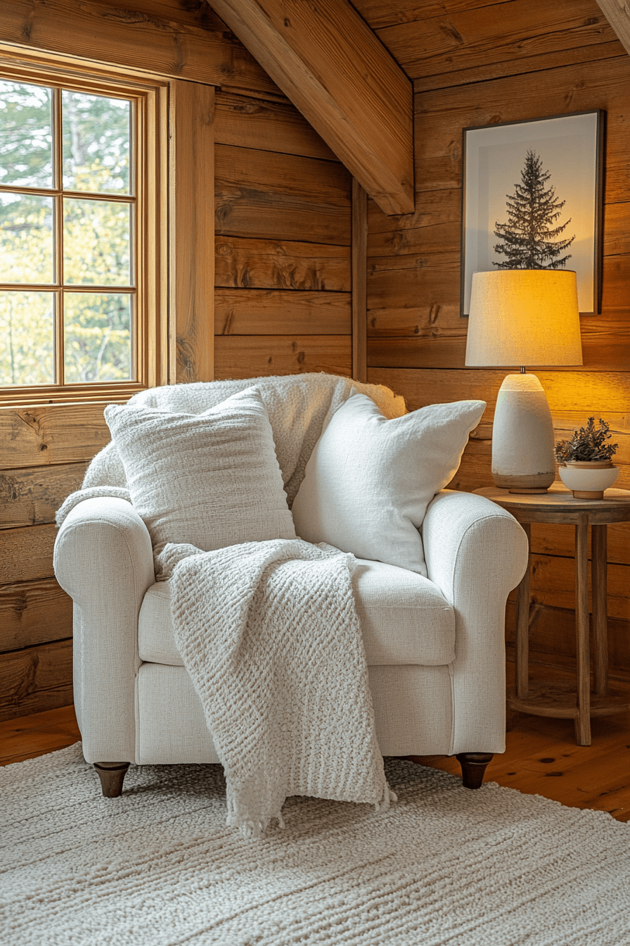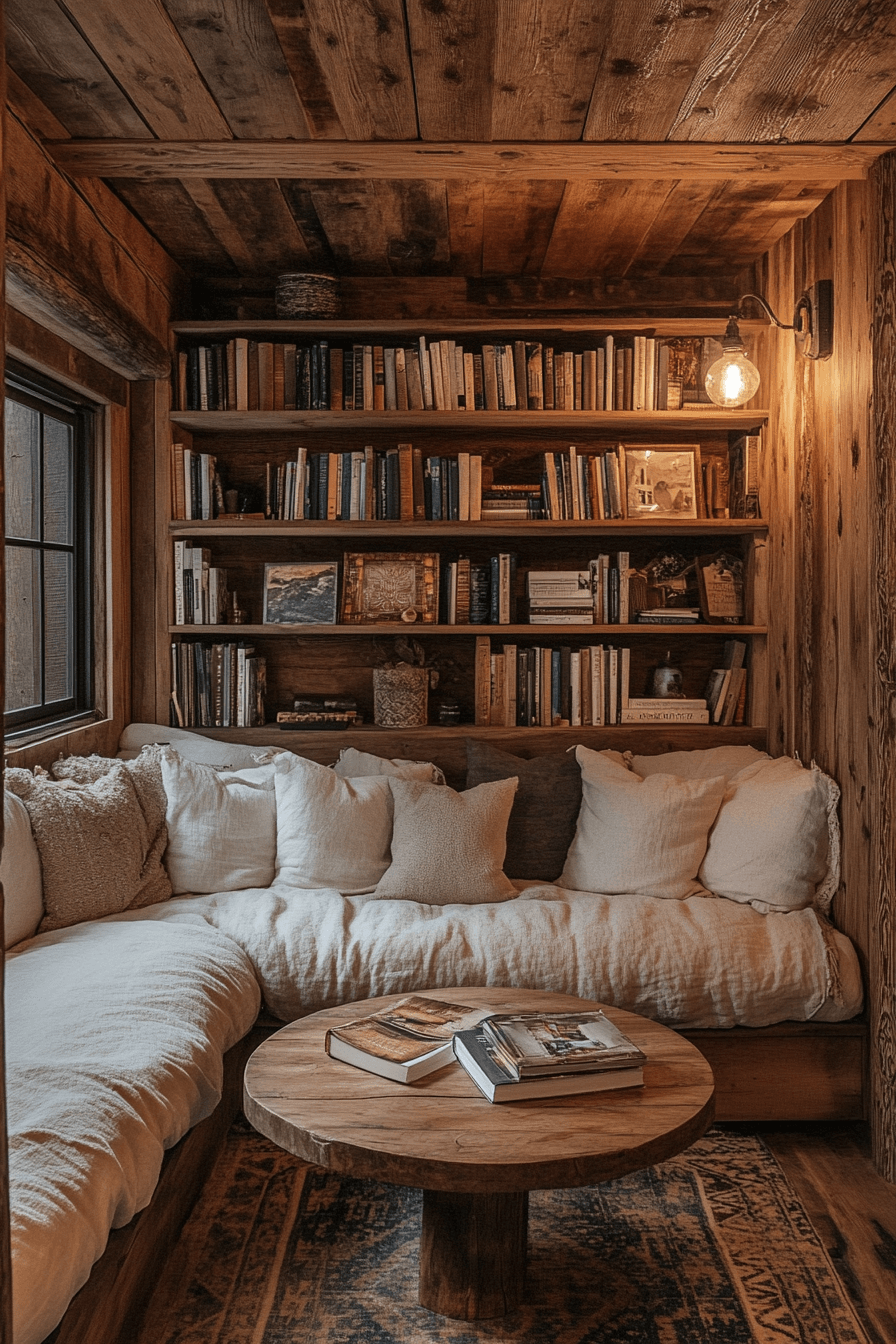 This inviting nook turns a little cabin living room corner into a peaceful hideaway. A plush seat, warm lighting, and rustic finishes make it a cozy spot for reflection. Built-in shelving keeps it functional without losing charm. The result is small-space bliss that feels personal and calm.