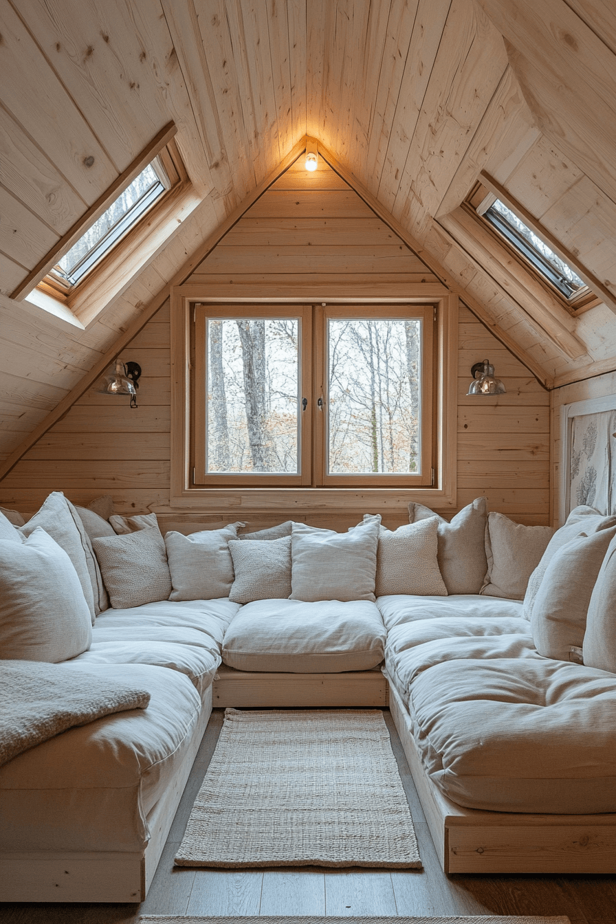 A charming loft lounge adds extra personality to this little cabin living room, using vertical space wisely. The upper nook features minimalist décor, warm wood finishes, and soft lighting. Natural sunlight from skylights makes it feel open and welcoming. It’s the perfect retreat for reading, relaxing, or unwinding above it all.