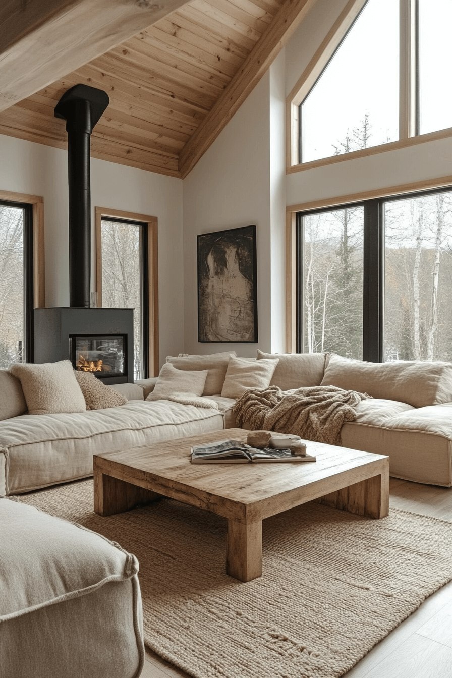 Simplicity takes center stage in this little cabin living room that’s both sleek and inviting. Clean lines, light wood, and soft neutrals make the space feel effortless and calm. Every element serves a purpose, combining comfort with clarity. The look is modern yet timelessly cozy.