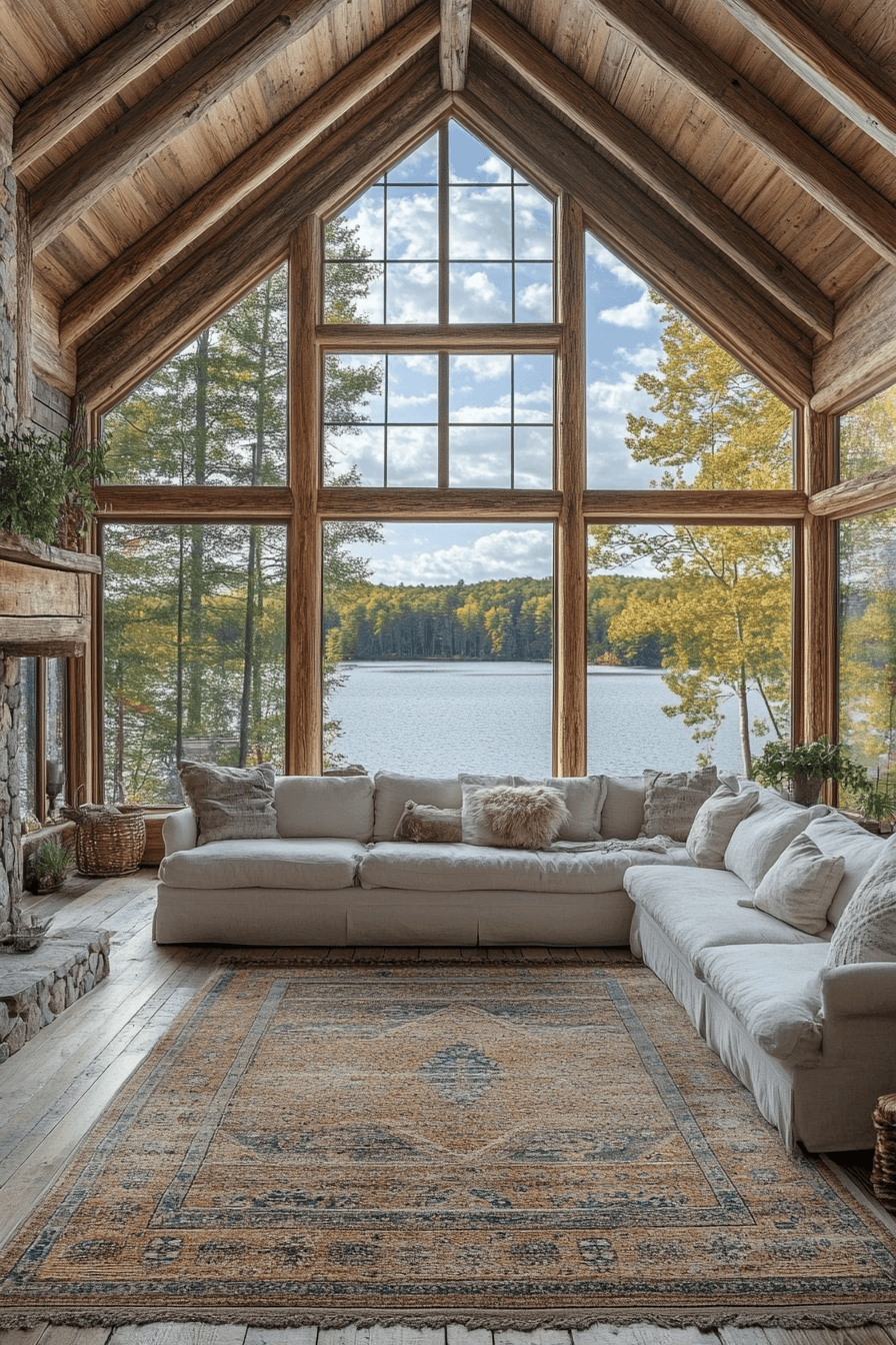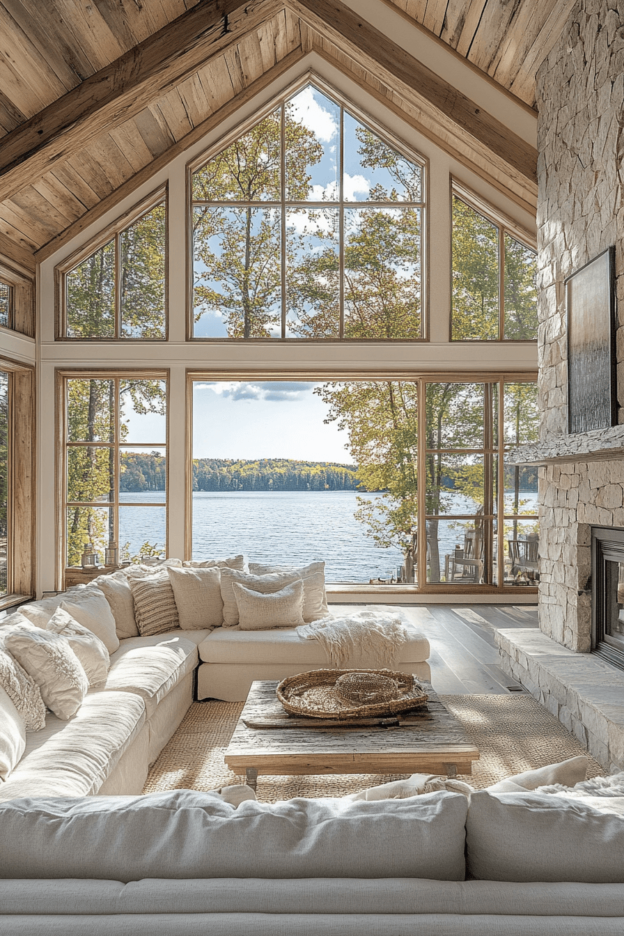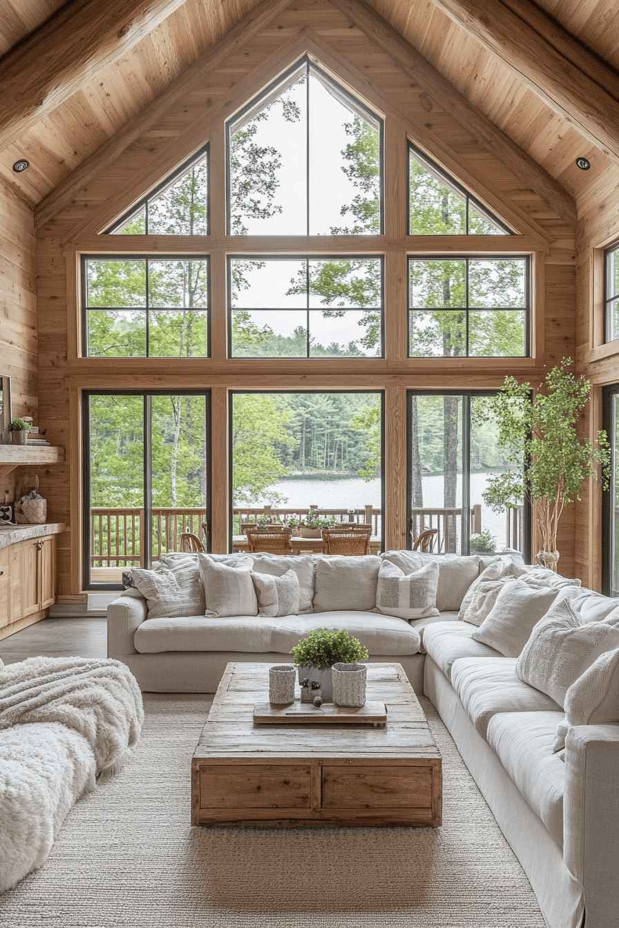 This lakeside-inspired little cabin living room turns breathtaking views into the centerpiece of the design. Large windows showcase tranquil waters while neutral interiors frame the beauty outside. Comfortable seating encourages peaceful moments of reflection. It’s the perfect escape for nature lovers.