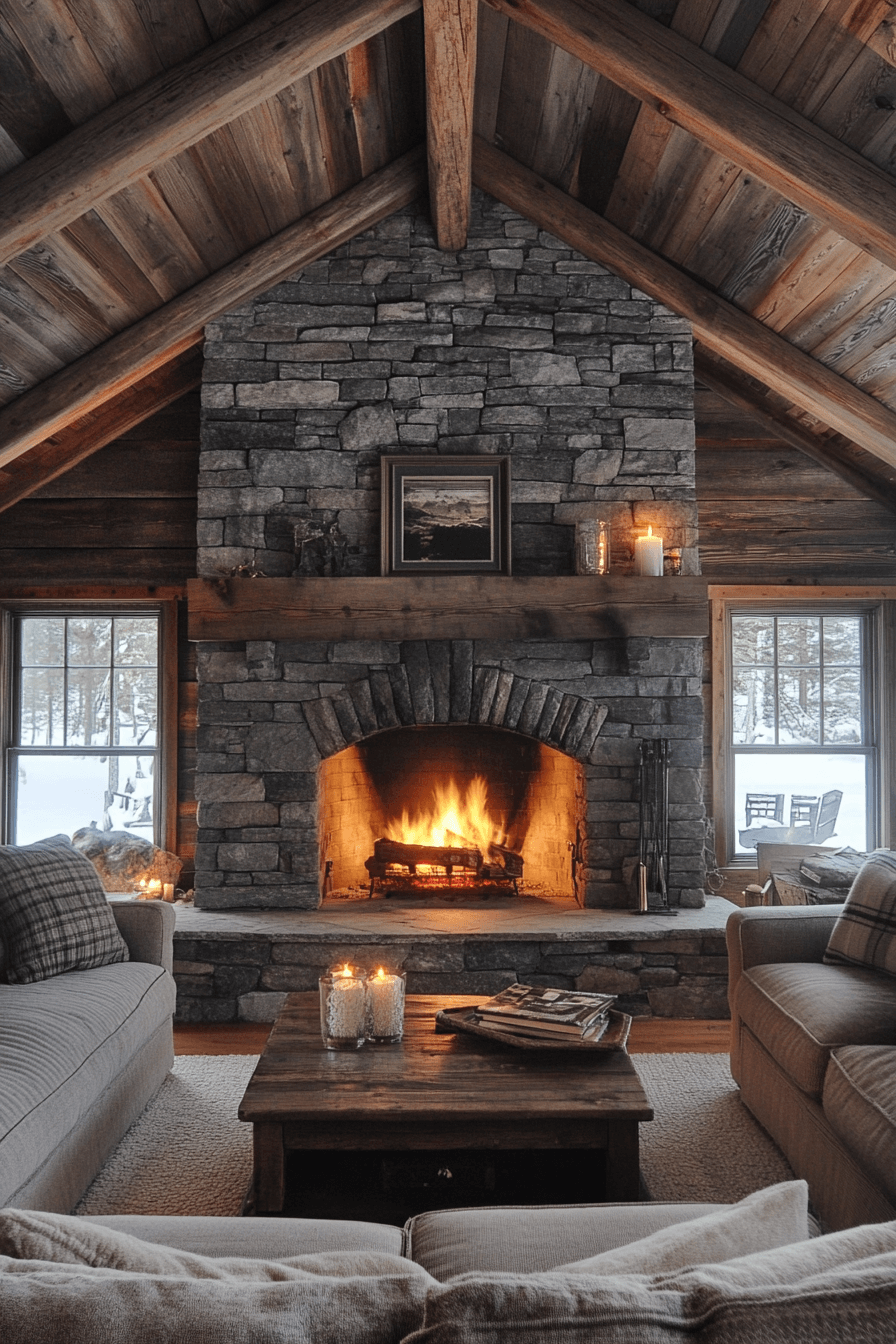 The fireplace takes center stage in this little cabin living room, becoming both art and warmth combined. Rustic wood, natural stone, and plush seating create a space that feels timeless and inviting. The glow of the fire adds a romantic, nostalgic touch. Every night feels like a peaceful escape in front of the hearth.