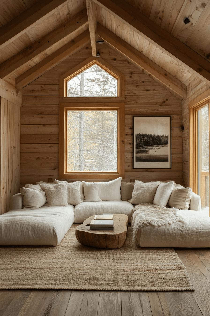 Natural wood shines in this little cabin living room, wrapping the space in warmth and organic beauty. Every beam, floorboard, and handcrafted piece adds texture and coziness. Neutral furnishings and soft lighting balance the rich tones of the wood perfectly. The result is a timeless space that feels luxurious yet grounded.