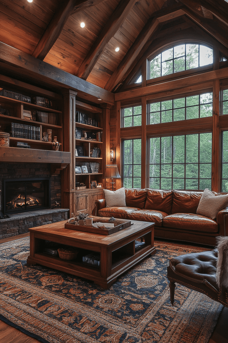 Vaulted ceilings make this little cabin living room feel grand and inspiring. Exposed beams draw the eye upward, while natural materials keep the space grounded. Large windows flood the room with mountain light, creating a feeling of openness. It’s an architectural statement with heart-warming comfort.