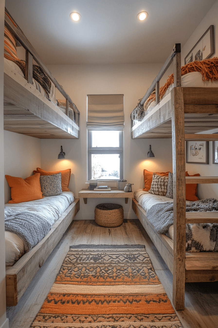 Get cabin vibes with rustic bunkhouse-style loft beds for small rooms. Crafted with warm wood tones and cozy finishes, this setup offers a homey escape in even the smallest bedrooms. Built-in drawers or seating beneath the bed enhance functionality while adding rustic charm. It’s great for anyone looking to bring the outdoors inside. The aesthetic is warm, welcoming, and totally space-savvy.