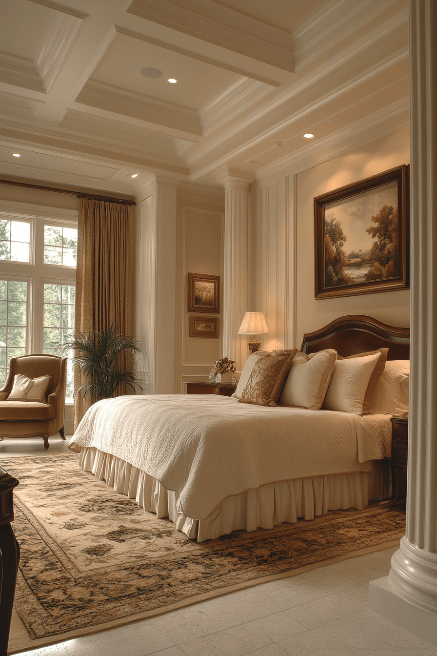 Classic architectural details meet plush modern comforts in this luxury bedroom master. Ornate moldings, stately columns, and sumptuous textiles create a look that’s rich with history and style. It’s a perfect marriage of tradition and sophistication.