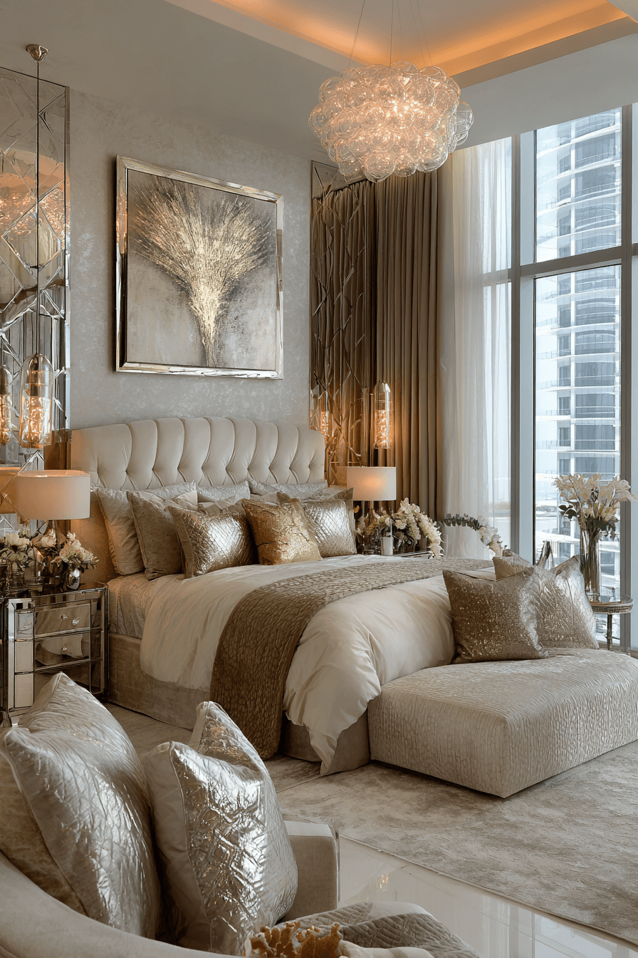 Shimmering metallic hues pair beautifully with clean lines in this luxury bedroom master. Reflective finishes, metallic wall accents, and contemporary furniture create a striking balance between modern style and glamour. Light bounces effortlessly across the space for a chic, luminous effect.