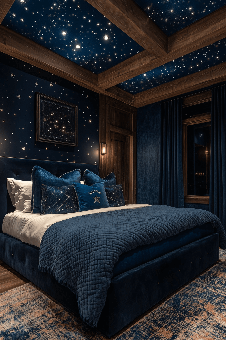 Celestial accents and moody colors infuse this luxury bedroom master with mystery. Starry patterns, cosmic artwork, and rich textures create a dreamlike retreat. It’s an ideal setting for stargazers and dreamers alike.